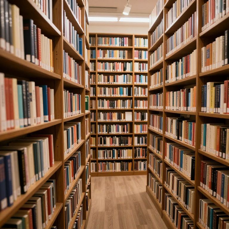 Photograph of a library aisle with tall, wooden bookshelves on both sides, filled with a colorful assortment of books. The shelves are evenly spaced, creating a narrow, rectangular pathway leading to a brighter background at the end. The books are neatly arranged, with spines facing outwards, displaying a variety of colors and sizes. The floor is made of polished wood, matching the shelves. Overhead, recessed lighting provides even illumination. The image has a warm, inviting atmosphere, emphasizing the organized and serene library setting.