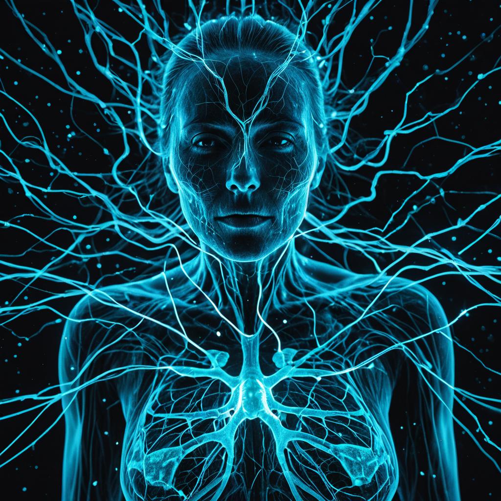 Digital art of an infected woman glowing bioluminescent energy from within, showing a semi-translucent body revealing intricate vascular and neural structures. The image captures the moment of molecular breakup with decaying radioactive molecules and centripetal motion blur effects, emphasizing the glowing blue vascular network against a dark background.