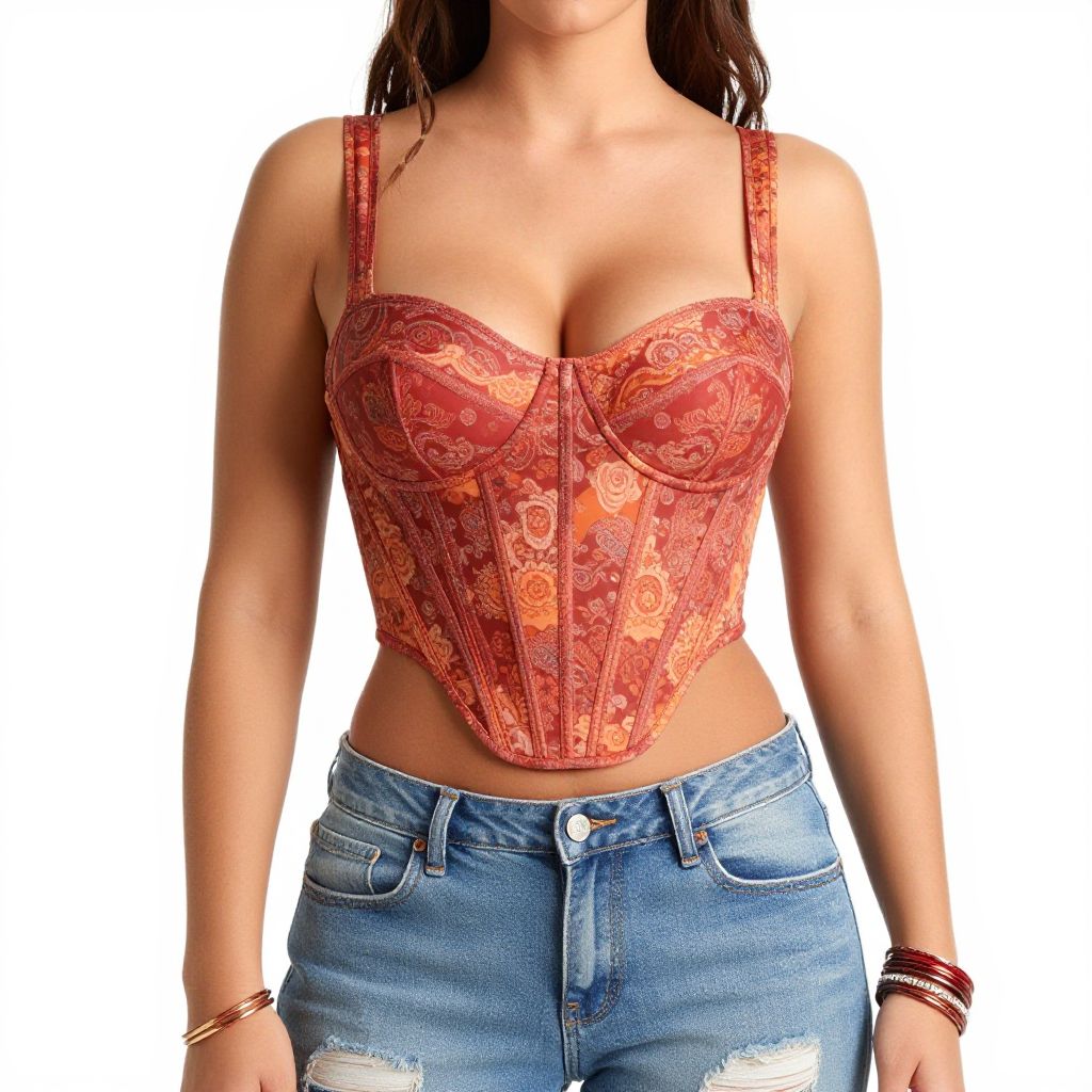 "Woman, bohemian, corset-style top with paisley and floral patterns in shades of red and ochre, structured bodice, thin straps, scoop neckline, faded blue denim jeans with a frayed hem, multiple bangles on one wrist, braided hair, plain white background.. Sexy. Pretty face and beаutiful eyes. Big breasts."