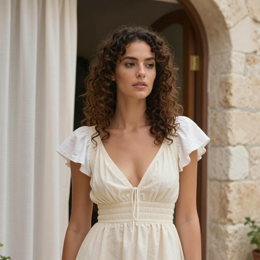 A photograph of a woman with curly brown hair, wearing a cream-colored dress with white puffed sleeves and a deep neckline, standing in a doorway with a white curtain to the left and a stone wall to the right. She has a neutral expression and is looking slightly to the side.