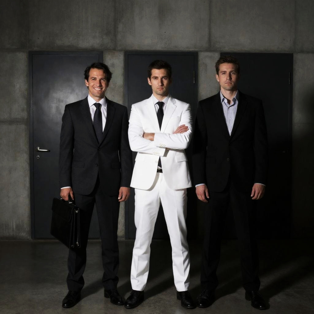 Photograph of two men standing back-to-back with arms crossed. The man on the left has short brown hair, light blue shirt, and serious expression. The man on the right wears a black hat, glasses, gray suit, and white shirt, with a confident expression. White background.
