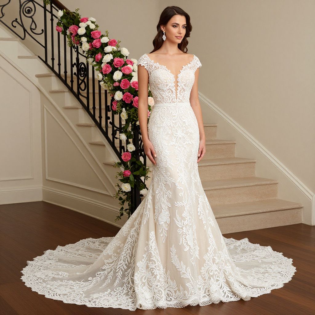 Photograph of a brunette woman with wavy hair wearing an elegant, white lace wedding dress with a deep V-neck and cap sleeves. The dress features a fitted bodice and a long, flowing train. She stands on a wooden floor in front of a white staircase adorned with a black wrought iron railing. A floral arch with pink, white, and green flowers is positioned to the left. The woman wears dangling earrings and looks slightly to the right, with a neutral expression. The background is a plain, cream-colored wall.