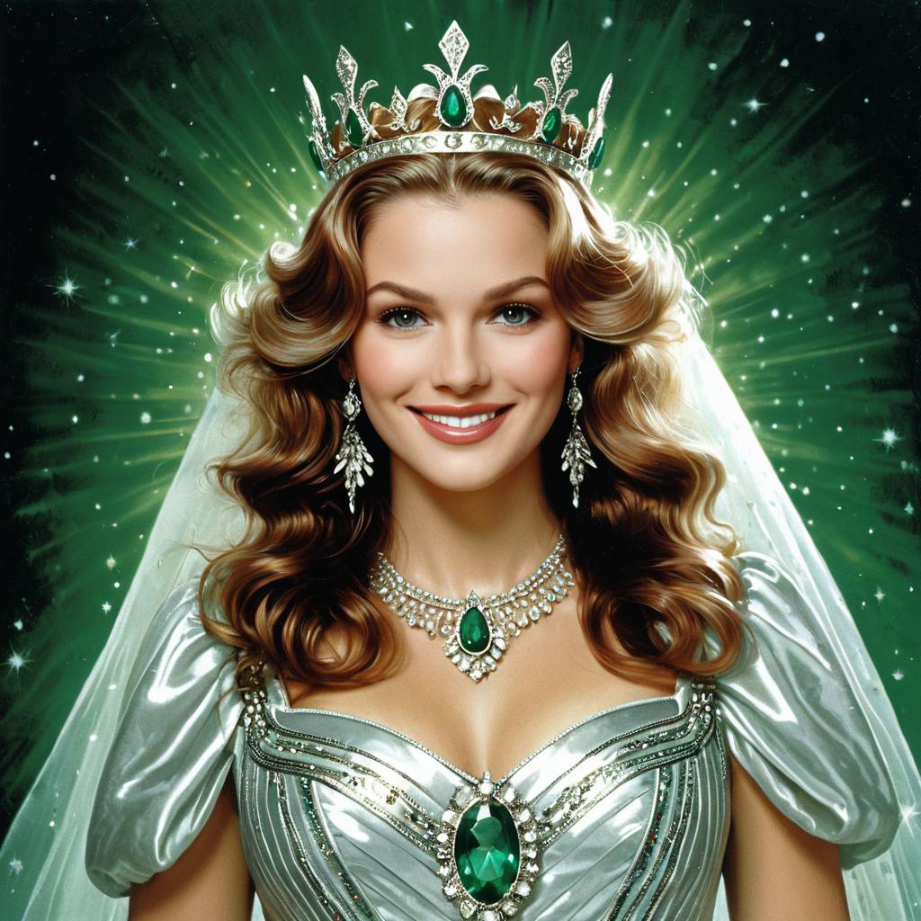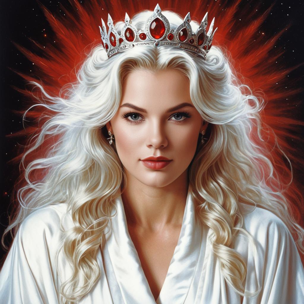 Transparent realistic vintage 90’s romance illustration portrait of a smirking ethereal, sassy, beautiful sprite with long copper-red, amber gold eyes in a gossamer cloak and majestic crown, front-facing with blowing hair, in the style of fantasy artist, Darrell K. Sweet
