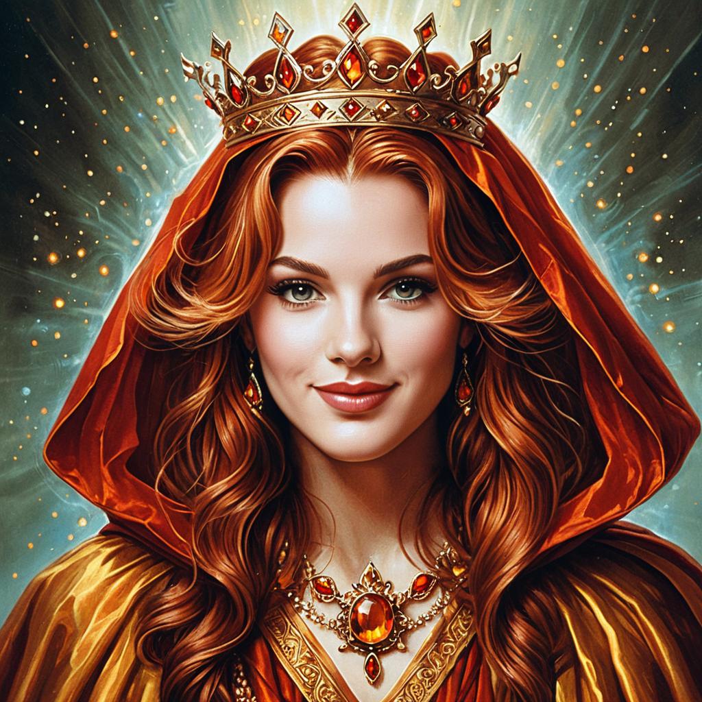 Digital illustration of a beautiful fantasy queen with long copper-red hair, amber gold eyes, and a majestic ornate crown. She wears a gossamer cloak in warm tones of amber and gold. The queen has a confident, sassy expression with a slight smirk, radiant skin, and elegant jewelry featuring large amber gemstones. The background is ethereal with glowing particles and soft light rays, enhancing the magical atmosphere.