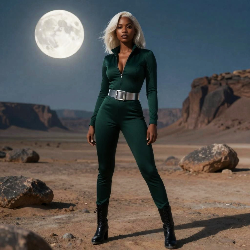 Photograph of a confident Black woman with platinum blonde hair standing in a desert landscape under a bright full moon. She wears a dark green, long-sleeve, zip-up jumpsuit with a silver belt and black ankle boots. Her physique is slender and toned. The background features rocky, barren hills and scattered rocks, with a clear, deep blue sky. Her expression is serious, and she stands with her feet apart, facing the camera. The moon's light casts a soft glow on her hair and outfit, highlighting the contrast between her dark attire and the bright moon.