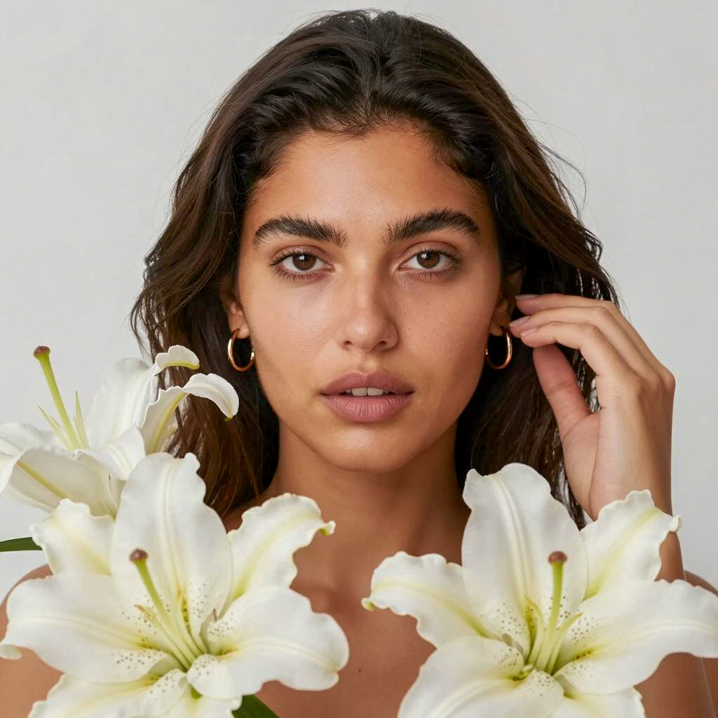 Close-up portrait of a woman with dark brown hair and medium skin tone, surrounded by large white lilies. She has intense brown eyes, full lips, and is wearing gold hoop earrings. Her right hand touches her hair against a plain white background. The white lilies frame her face and upper body, creating a natural and elegant composition.
