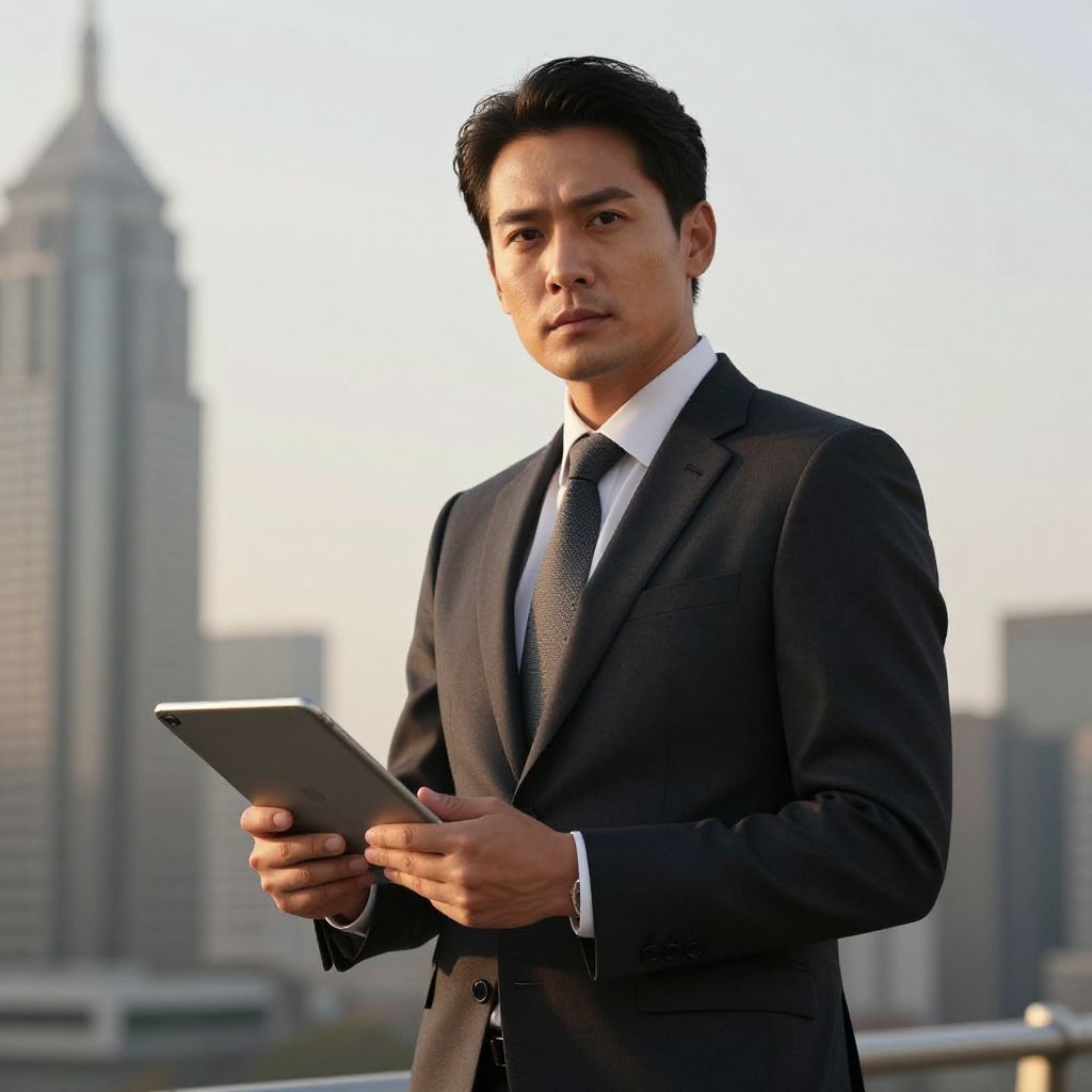 A sophisticated businessman in a sharp suit standing in a modern city skyline, holding a tablet, looking confidently into the camera, with soft golden hour lighting and a minimalist background — cinematic, realistic, high-detail, Flux style.