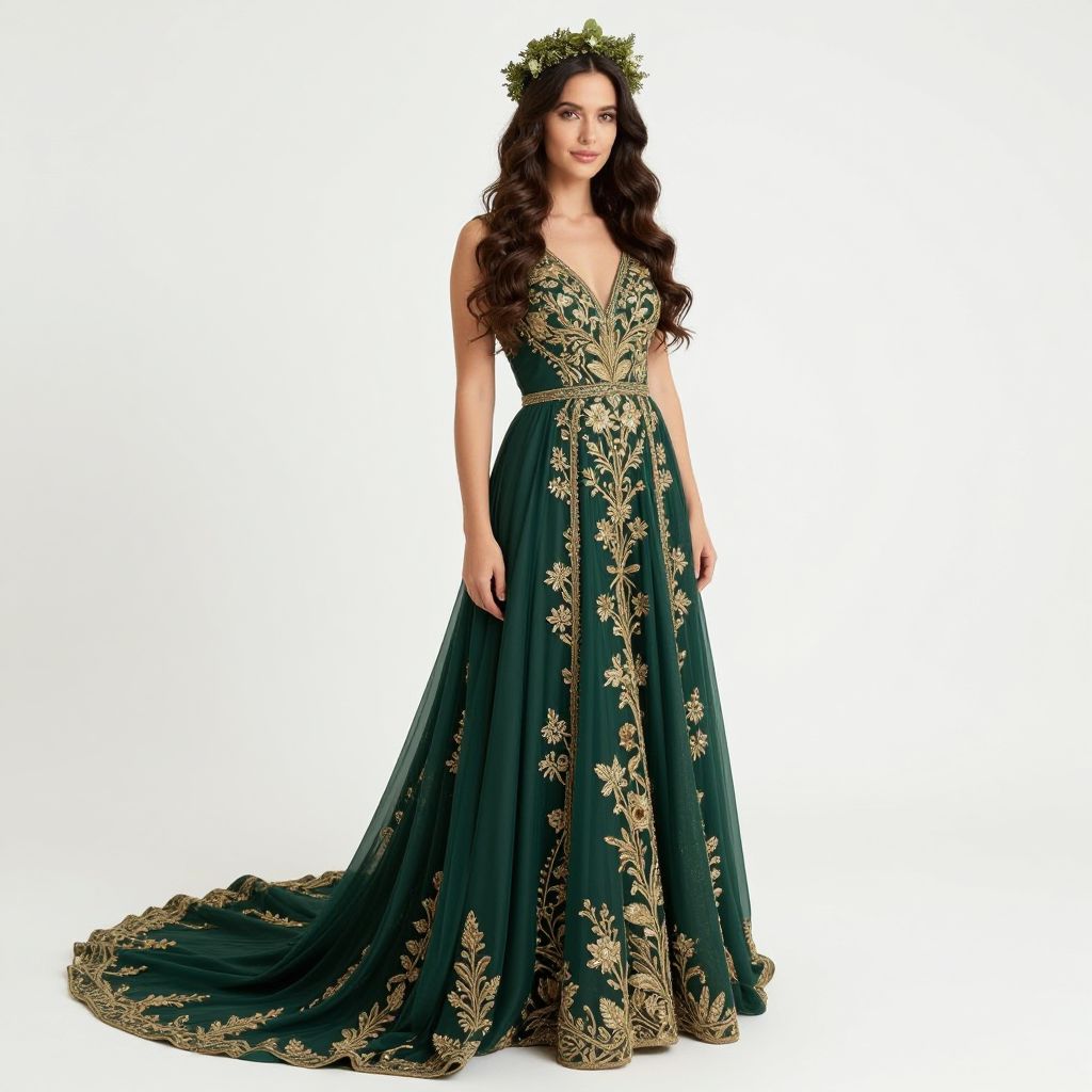 A woman stands gracefully wearing an elegant dark green gown adorned with intricate gold embroidery and a flowing train. Her long, wavy hair cascades around her shoulders accented by a delicate crown of greenery, evoking a regal and ethereal style.