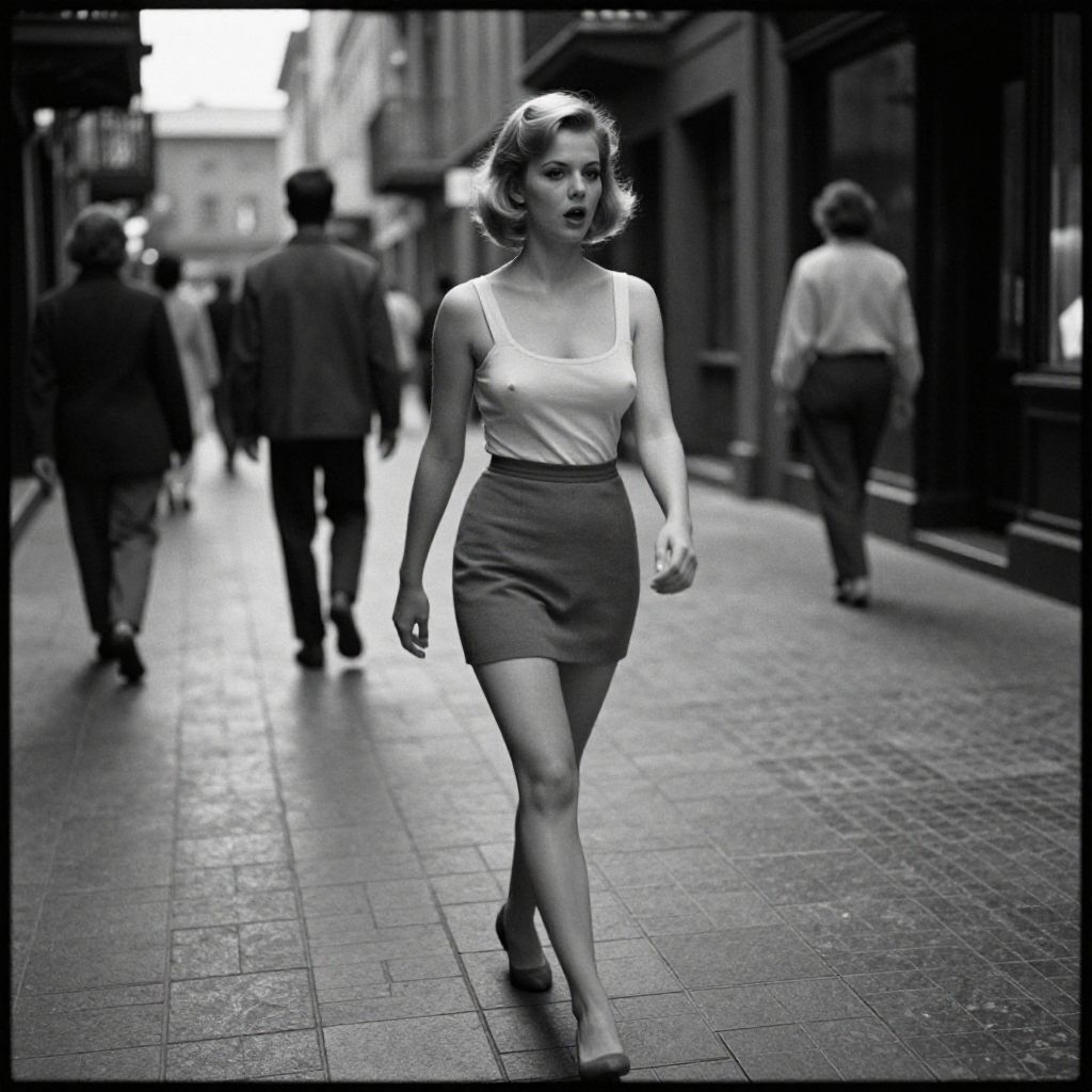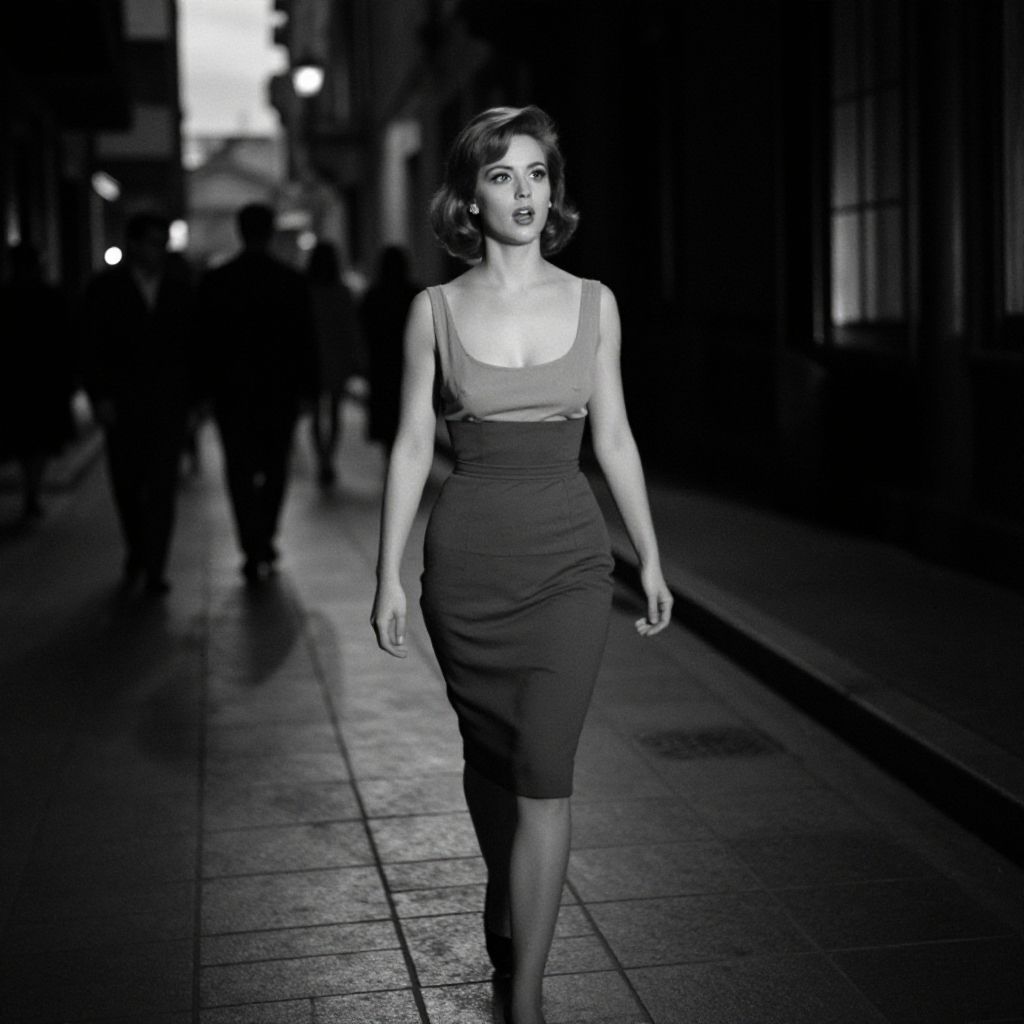 Score_9, score_8_up, score_7_up, score_6_up, score_5_up, score_4_up, score_7_up. Expressiveh, solo, short hair, open mouth, 1boy, monochrome, greyscale, male focus, 1960s elegant woman looking over shoulder while walking small street, dark streets, noir, portrait, realistic, tiles, horror (theme), realism, detailed, high detailed, perfection, perfect, filmic, retro, vintage, classic, different haircut, different look, different style, 1960's style, 1960 style, shallow depth of field, vignette, highly detailed, high budget, bokeh, cinemascope, moody, epic, gorgeous, film grain, grainy black and white, small breasts, cleavage, top pulled down, nipple visible, narrow waist, wide hips, skinny, curvy, petite, whole body, legs, female focus