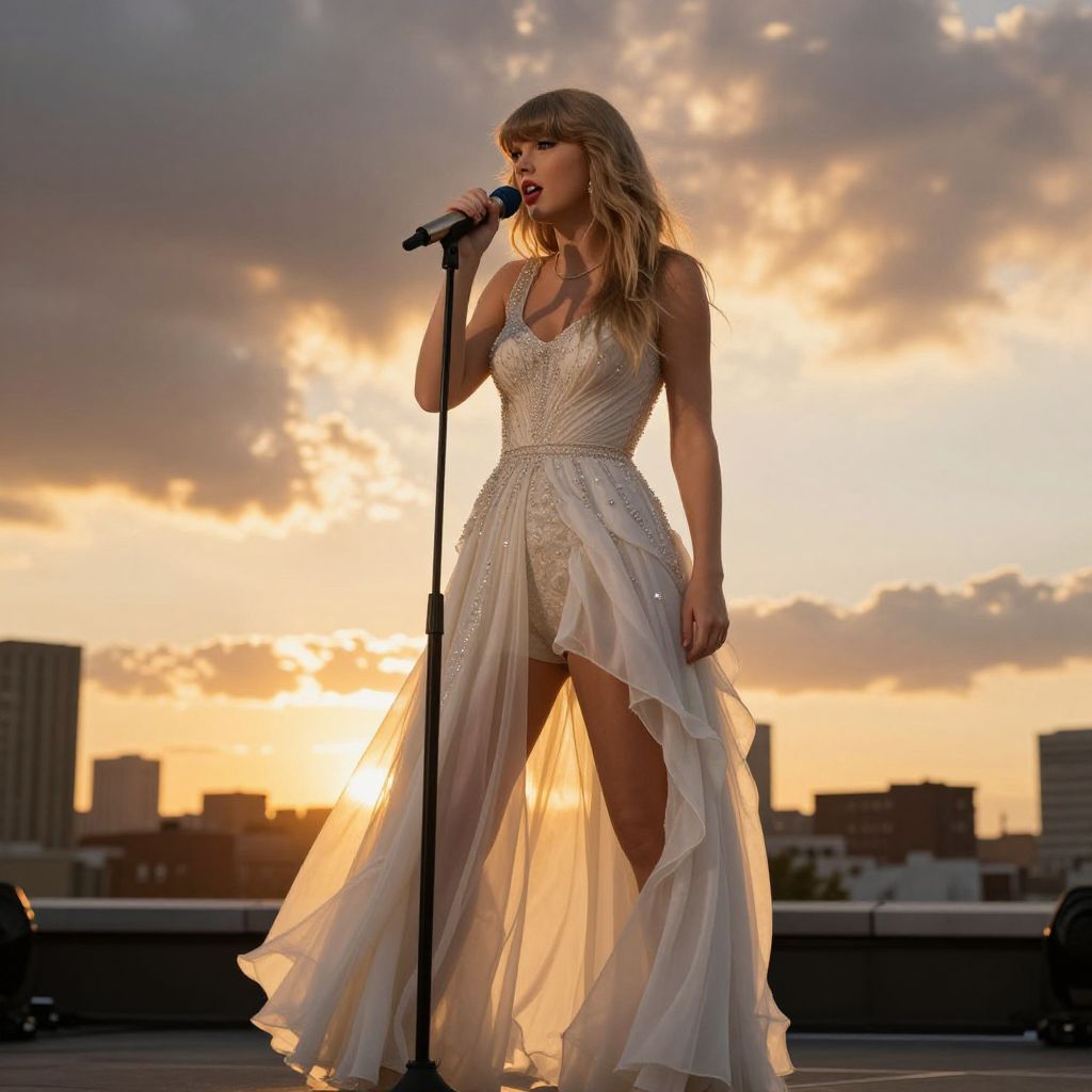 Taylor Swift secy performing on a rooftop at sunset, dramatic clouds, city skyline, elegant flowing dress, microphone in hand, intense focused look, warm golden hour lighting