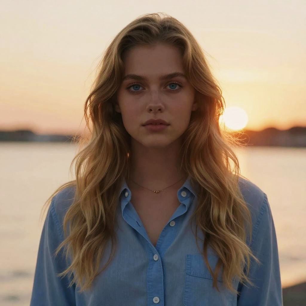 A photograph of a beautiful young woman with long, wavy blonde hair and striking blue eyes. She's wearing a black jacket and looking directly at the camera with a serious expression. The background is blurred with colorful bokeh lights, suggesting a nighttime cityscape. Her skin is fair, and the lighting highlights her features, giving her a slightly ethereal look.