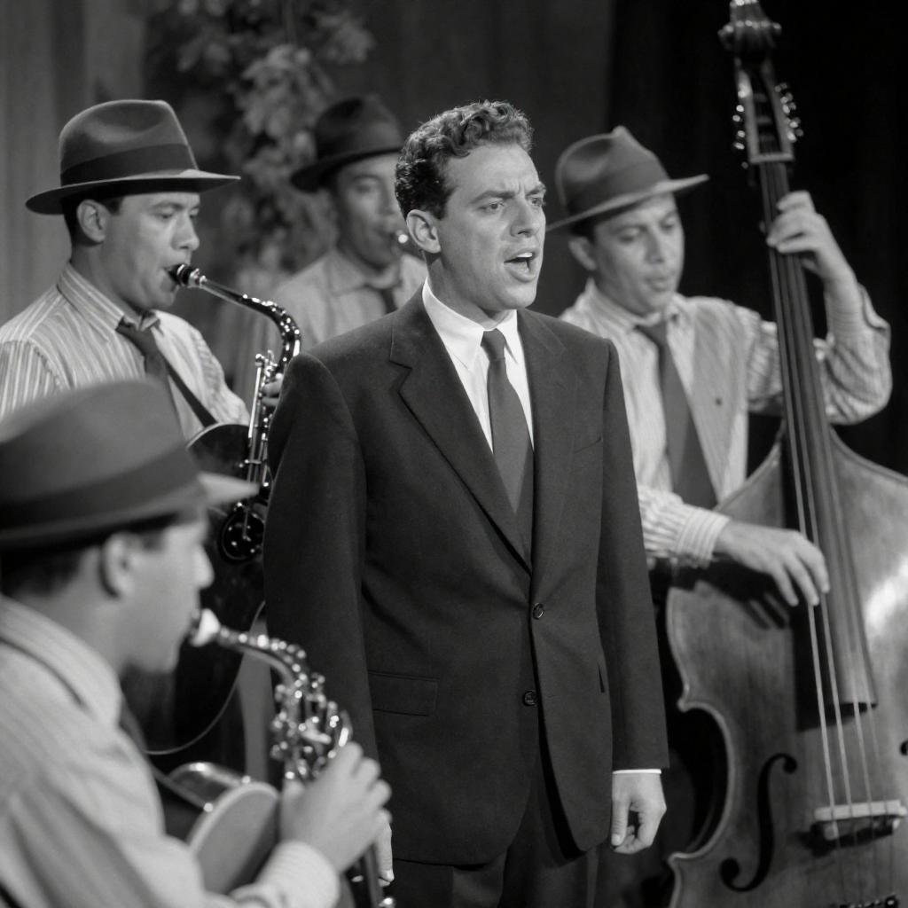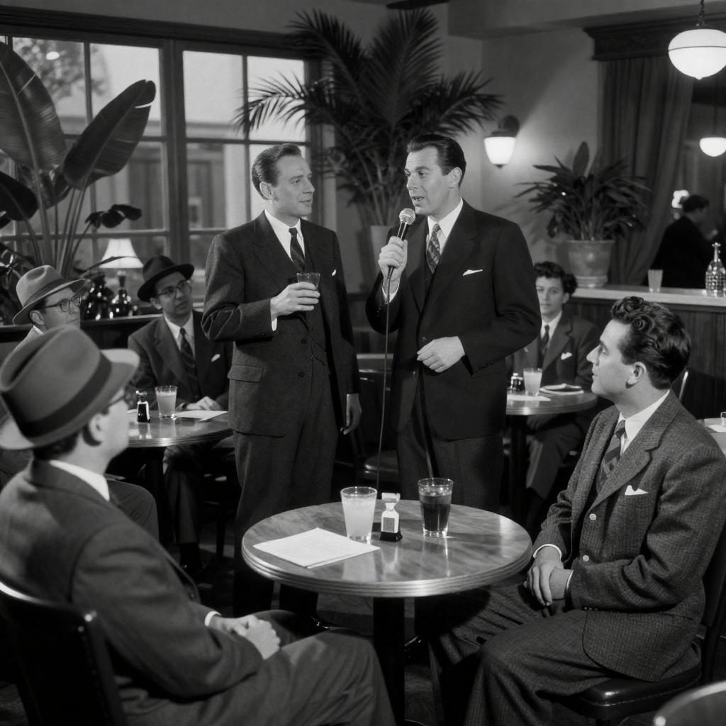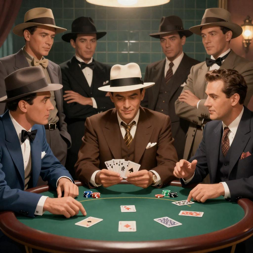 Black-and-white photograph of seven men in 1950s-style suits and ties, leaning forward with serious expressions. They wear leather jackets and hold money. Confetti falls around them. The background is a dimly lit, industrial setting. The men are closely packed, creating a sense of urgency and camaraderie.