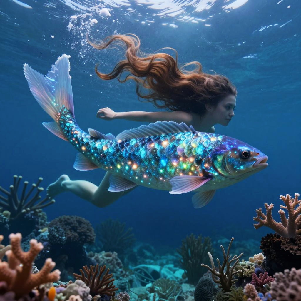 Hybrid human fish swimming gracefully underwater, bioluminescent scales glowing softly, flowing hair weaving with coral reefs, mystical oceanic fantasy scene, detailed anatomy and vivid colors