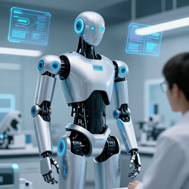 Photograph of a futuristic, silver humanoid robot with blue glowing eyes and joints, standing in a bright, modern laboratory. The robot has a sleek, metallic body with black internal mechanisms. Two holographic screens with blue digital text hover above its head and right shoulder. In the blurred background, there are laboratory equipment and another person in a white lab coat, seen from the back. The lab is well-lit with white and blue lighting, creating a high-tech, sterile environment. The robot's design is reminiscent of modern AI and robotics technology.