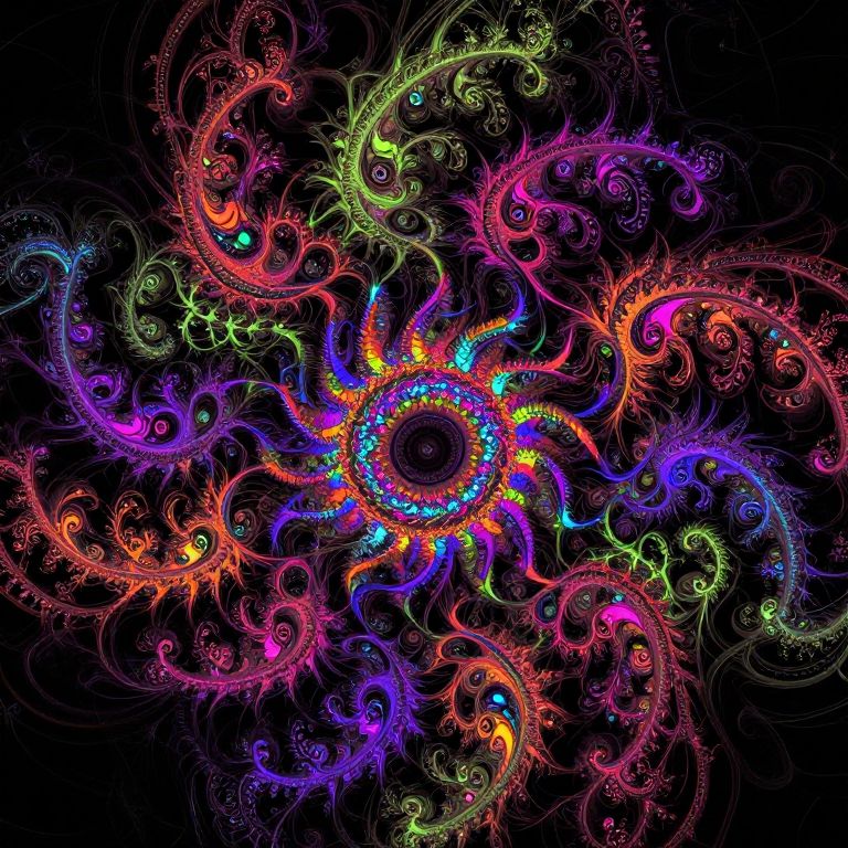 Mesmerizing intricate fractal patterns generating hypnotic spirals and shapes in bright neon colors, glowing against a dark background, evoking a sense of infinite depth and abstract beauty, digital art with high contrast and sharp details