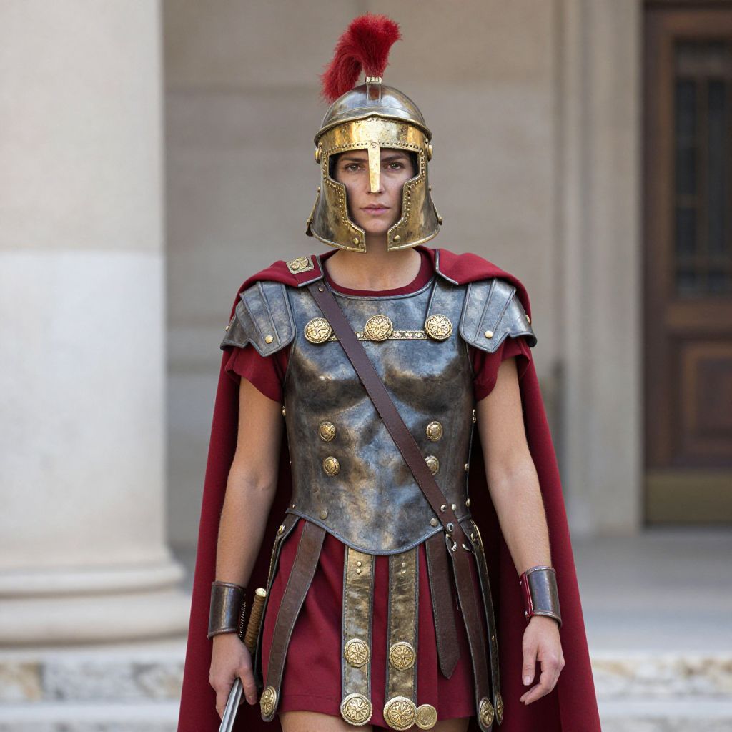 "Woman Roman Soldier, woman in a roman costume with a helmet and a red cape"