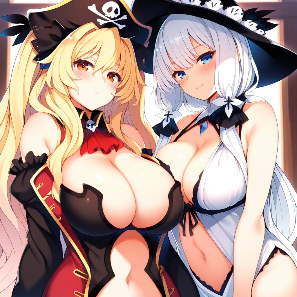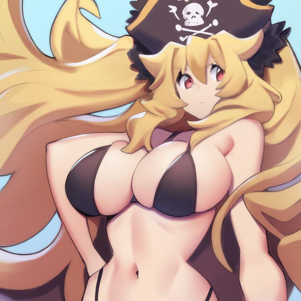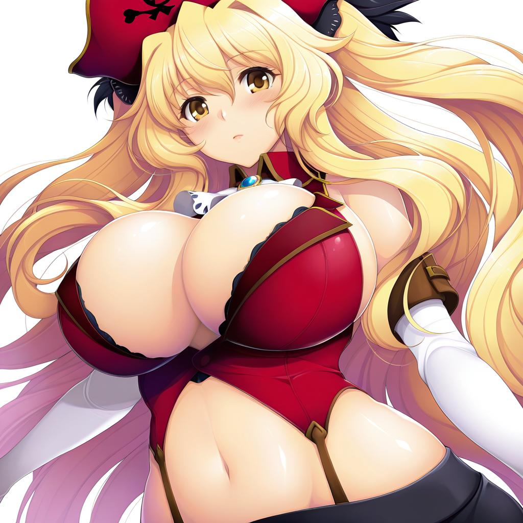 Anne bonny (fate), fate (series), 1girl, red eyes, hair between eyes, blonde hair, very long hair, long hair, twintails, two side up, large breasts, huge breasts, cleavage, navel, pirate hat, bare shoulders, by artist norza, animagine