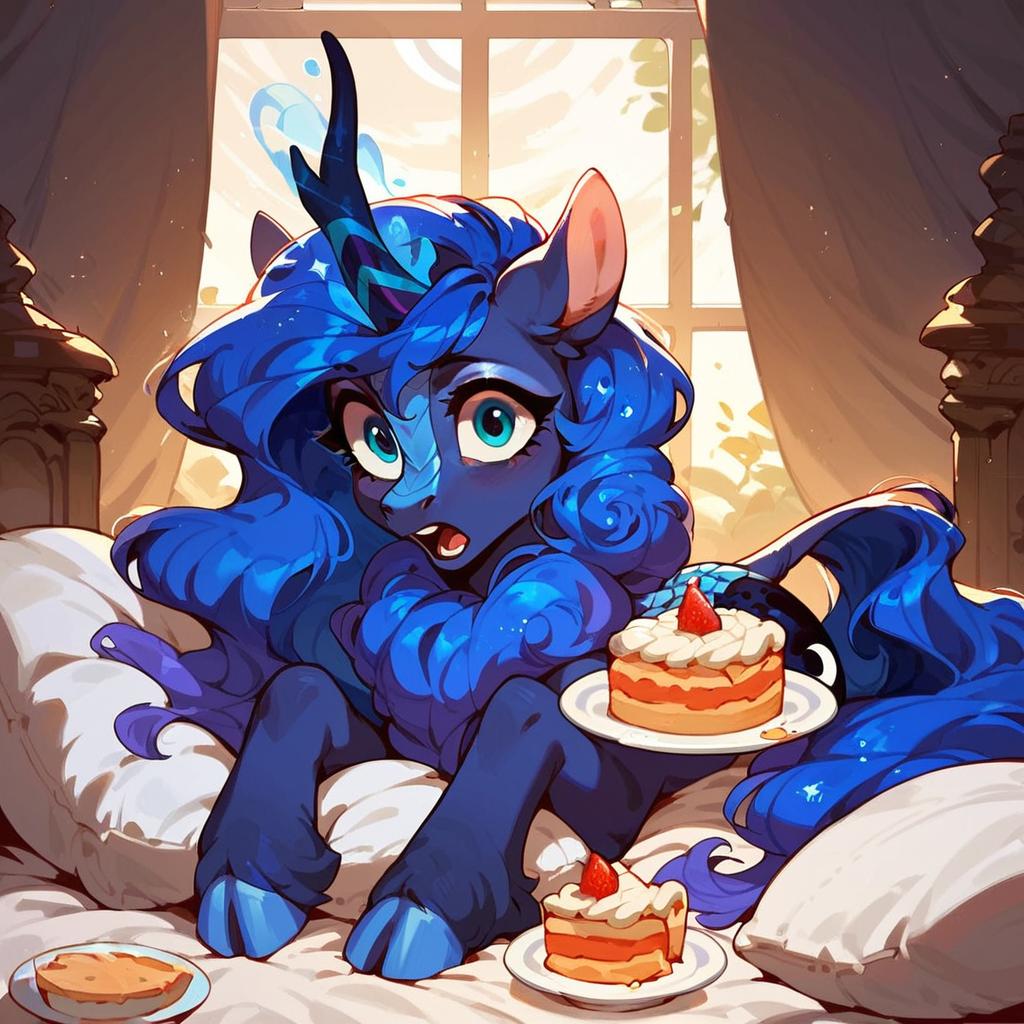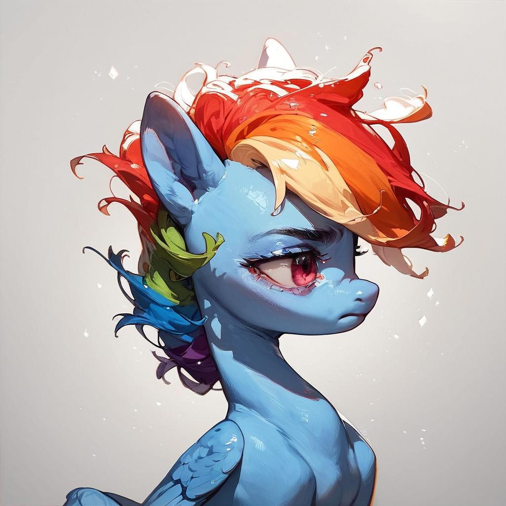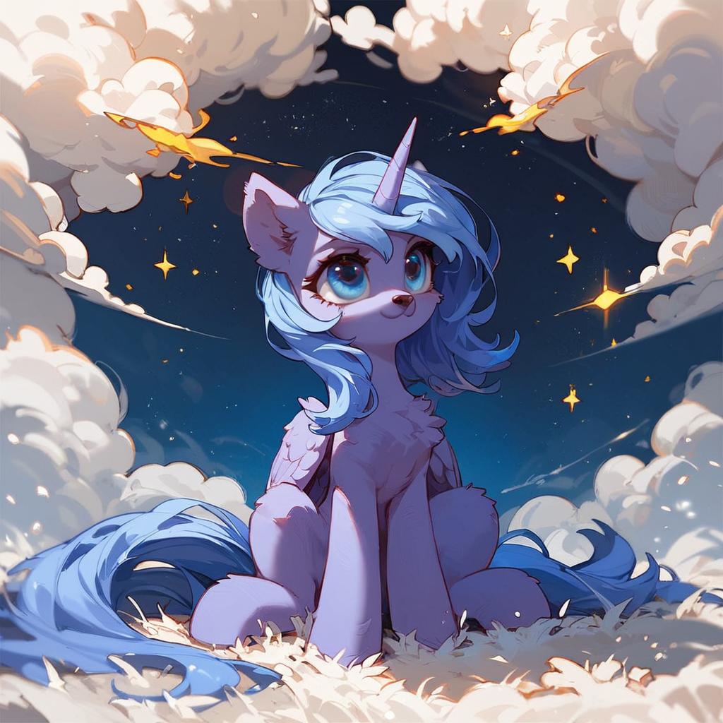 (alicorn), pony, woona, cutie mark:1.2, (score_9), solo, stars background, burning cloud, very beautiful, best quality, perfect anatomy, Impressionism, sitting on the ground, fluffy, (body fur), masterpiece, blurry, mlp art, lens flare, depth of field, cute