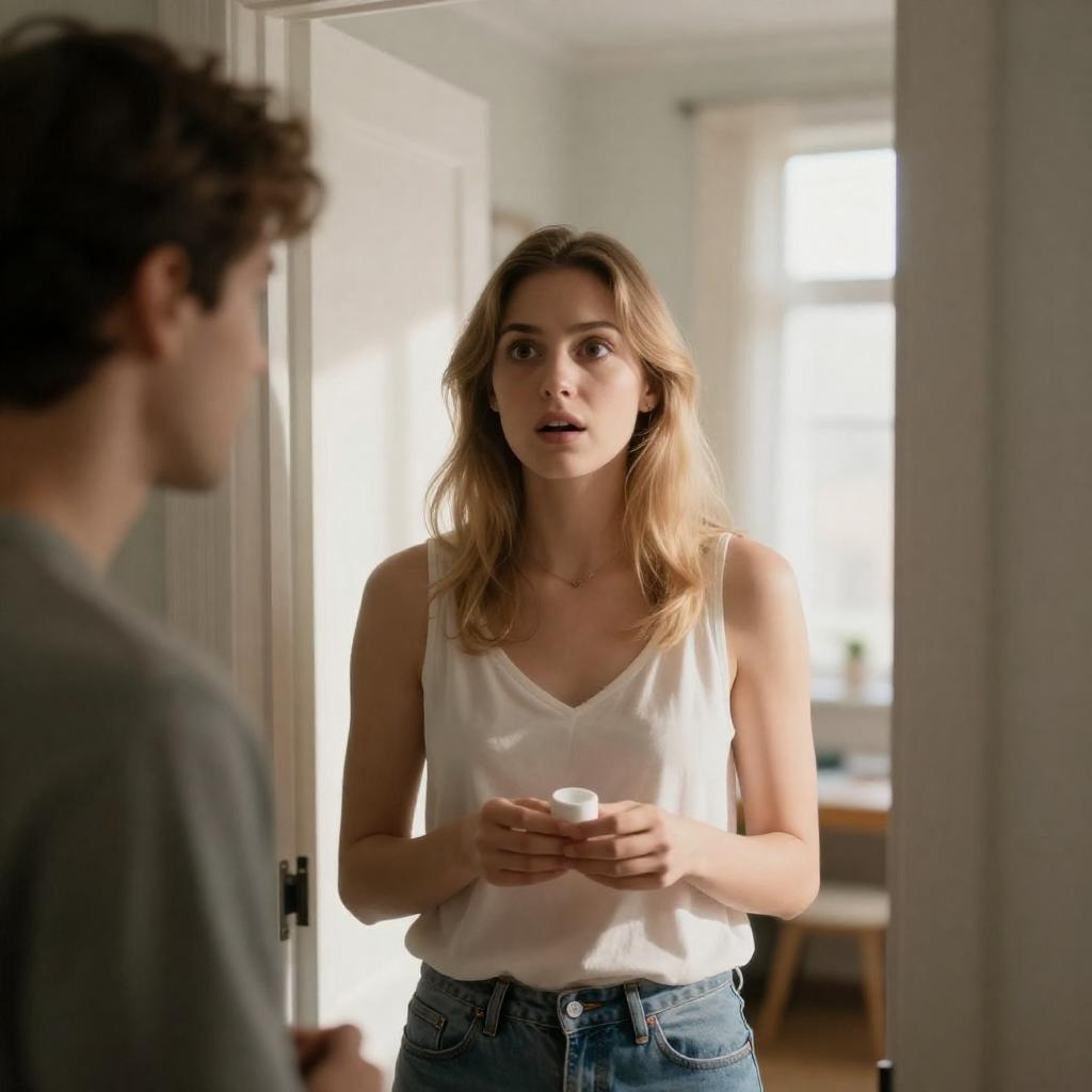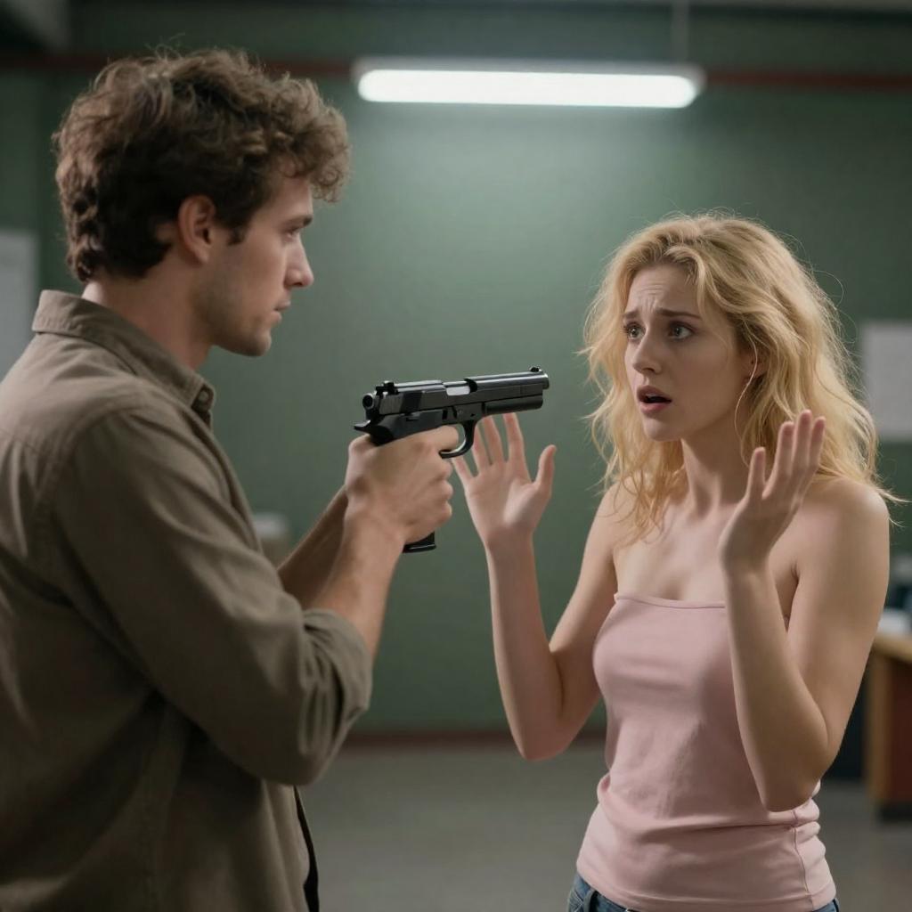 Young man with short curly brown hair wearing a brown shirt pointing a black handgun at a blonde woman with disheveled hair in a strapless pink top. The woman raises her hands in alarm and fear. The setting appears to be an industrial or office space with green walls and a fluorescent light overhead.