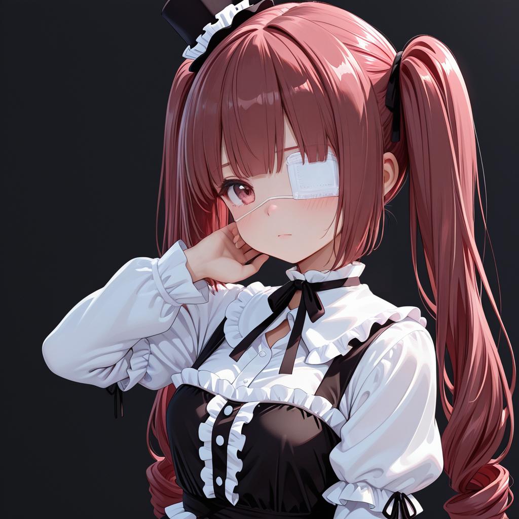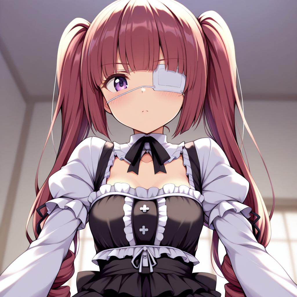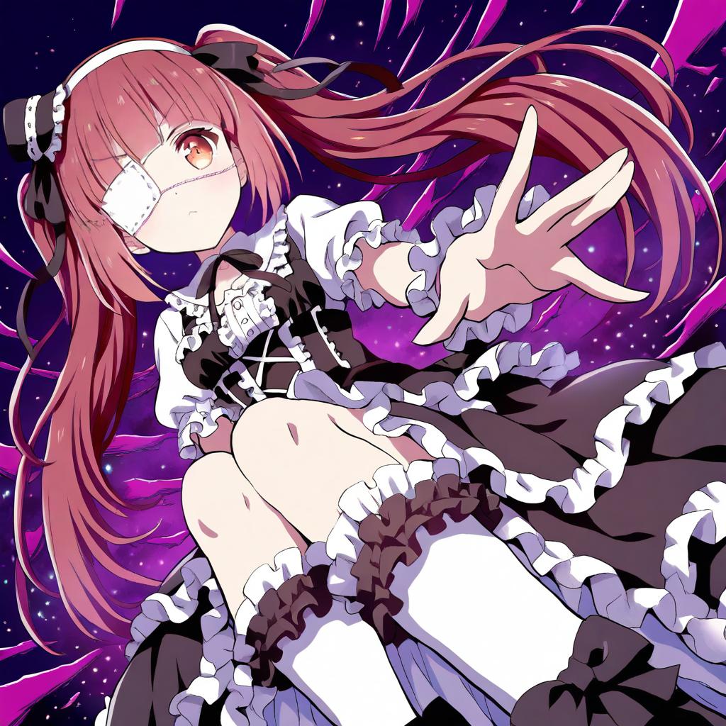 Hanazono yurine, jashin-chan dropkick, 1girl, red eyes, medical eyepatch, red hair, long hair, twintails, small breasts, frilled dress, gothic lolita, by artist disco brando, animagine