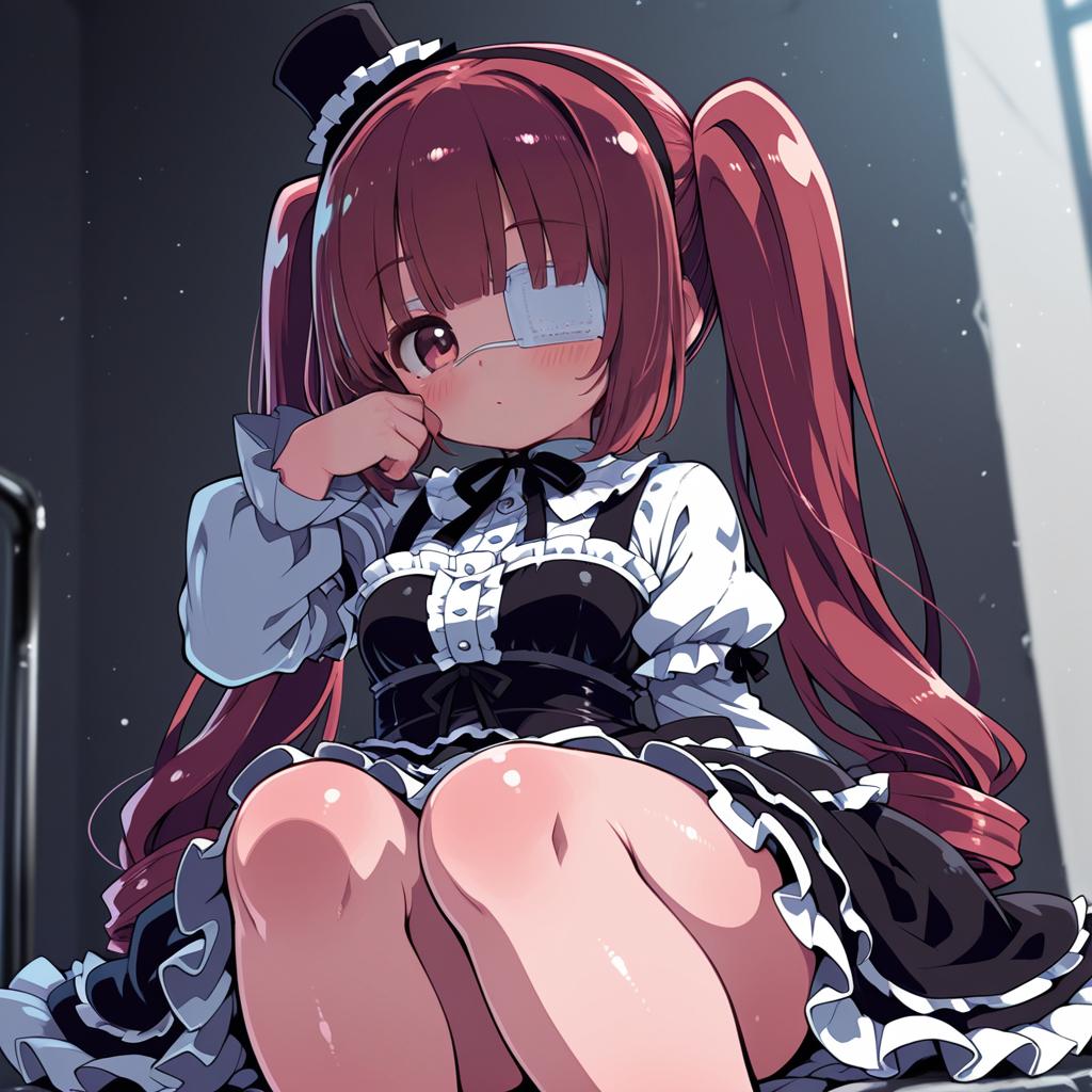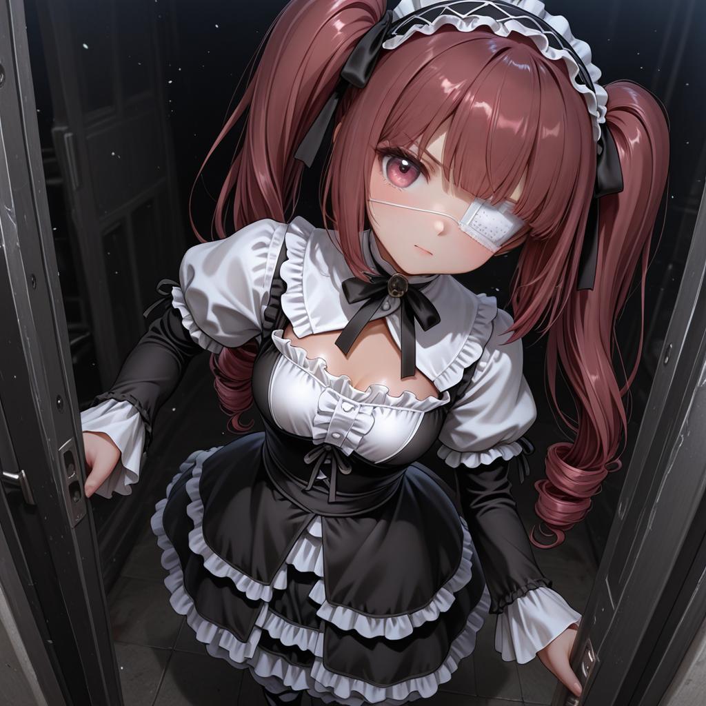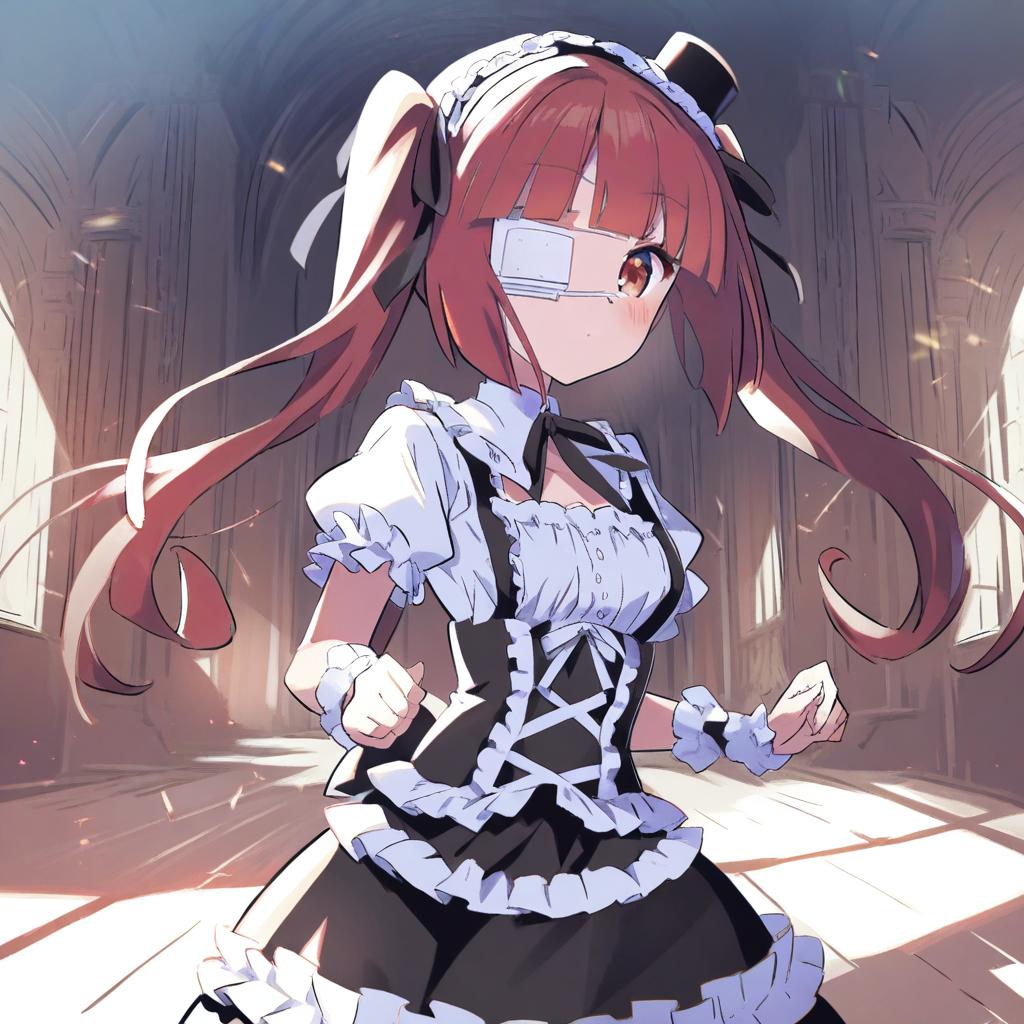 Hanazono yurine, jashin-chan dropkick, 1girl, red eyes, medical eyepatch, red hair, long hair, twintails, small breasts, frilled dress, gothic lolita, by artist disco brando, animagine