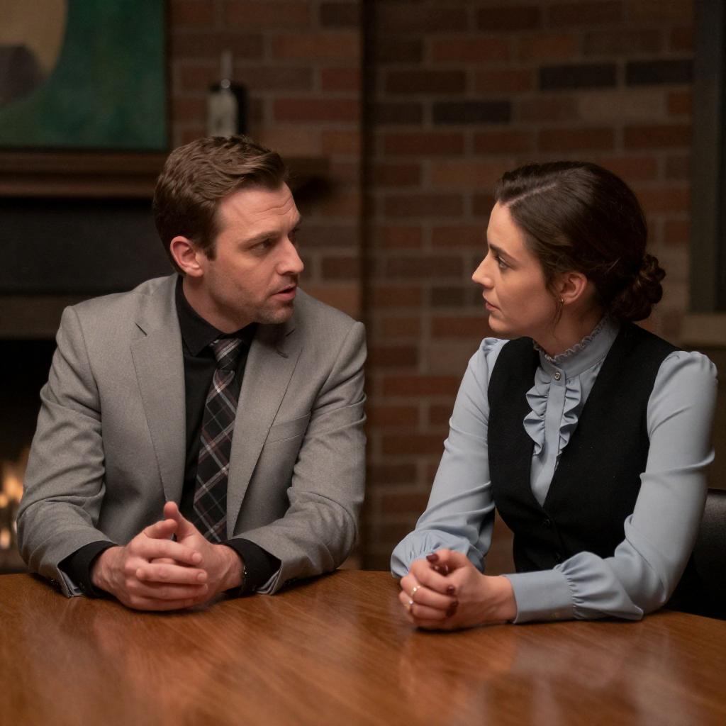 Man in dark leather jacket points sternly at woman in red sweater in kitchen. Wooden cabinets, dish rack, patterned wallpaper. Woman looks up at man, hands near face. Steam rises from counter. Intense expressions. Two people.