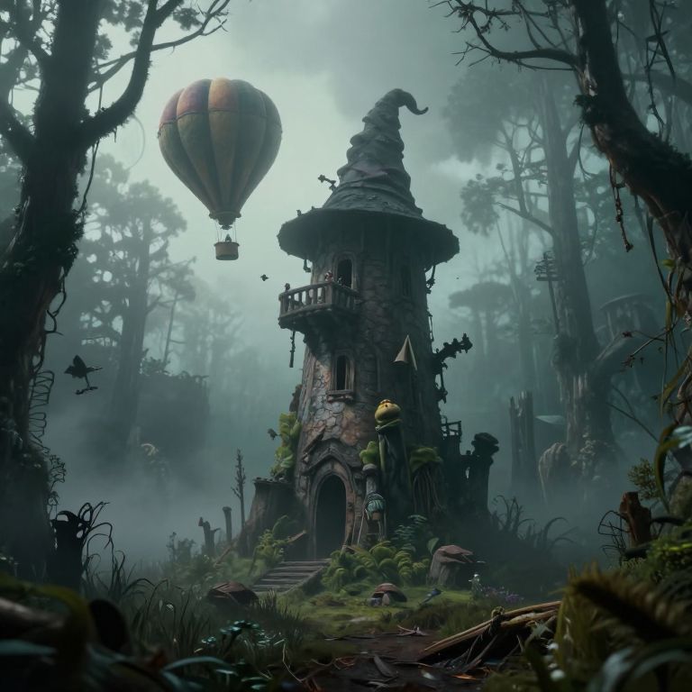 A whimsical, foggy swamp scene featuring a wizard tower in ruins, with a hot air balloon crashed into it, reminiscent of Jim Henson's style.