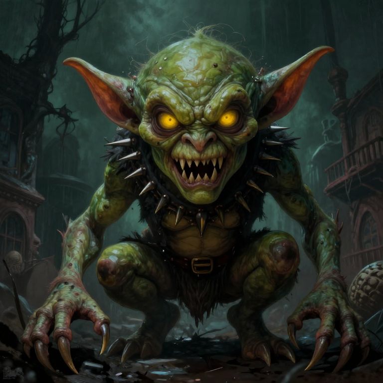 The image depicts a menacing Goozzle-Goblin, a Gremlin-like creature with long, sharp talons and a menacing expression. Its skin is a greenish hue, with sharp, jagged teeth and large, pointed ears. The Goozzle-Goblin is adorned with a dark, spiky collar, adding to its intimidating appearance. Its eyes are glowing yellow, giving it an otherworldly look. The creature is crouched in a dark, eerie environment, with buildings and structures in the background, creating a sense of depth and scale. The overall atmosphere is dark and ominous, with a painting-like quality that enhances the eerie and unsettling nature of the scene. The Goozzle-Goblin's sharp claws and the detailed textures of its skin and clothing contribute to the sense of danger and foreboding.
