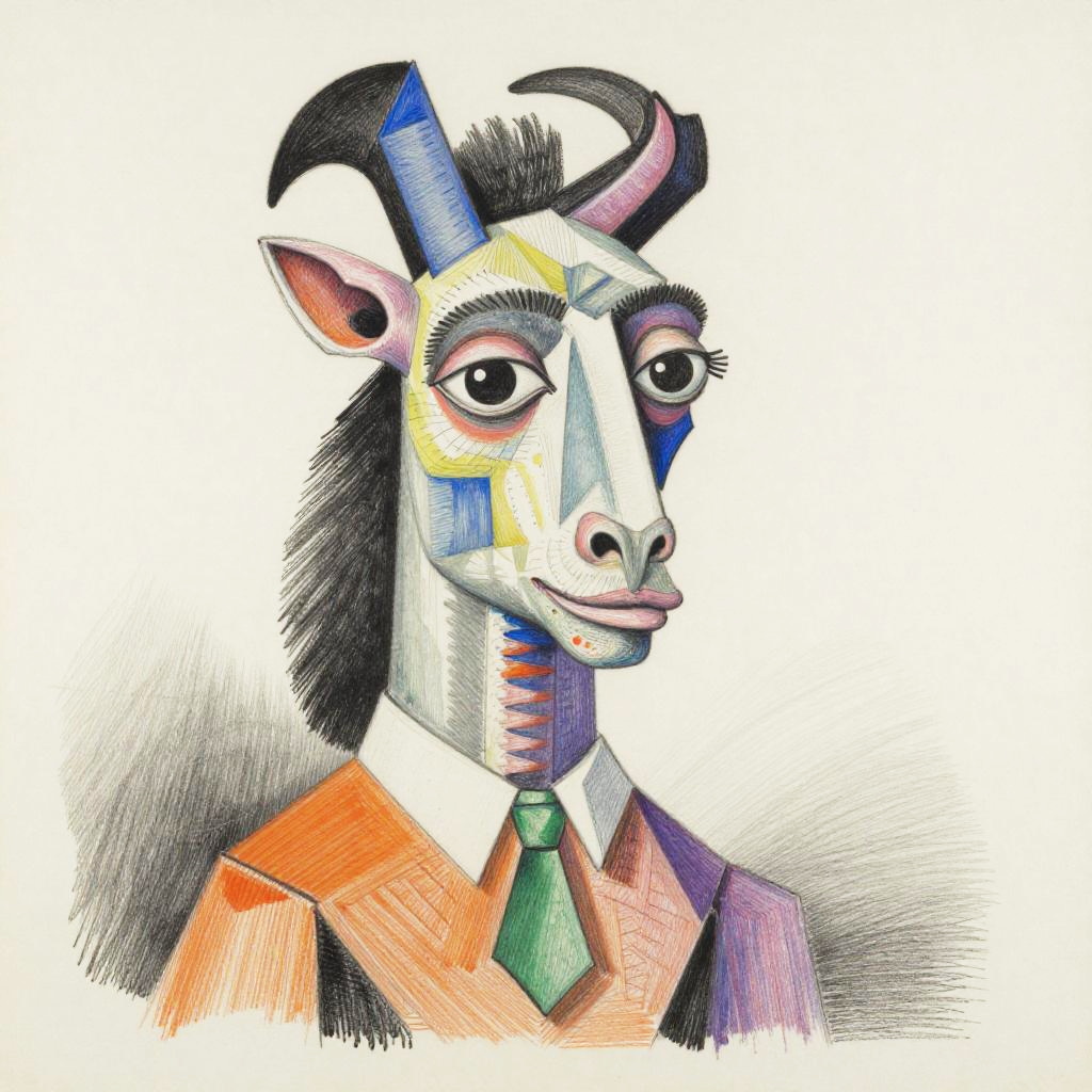 Mr. Alpaca in the style of Alexander Jansson and Picasso, with assured features, clean lines, expressive face, vibrant colors, detailed and imaginative art, retouched with pencil by Wassily Kandinsky