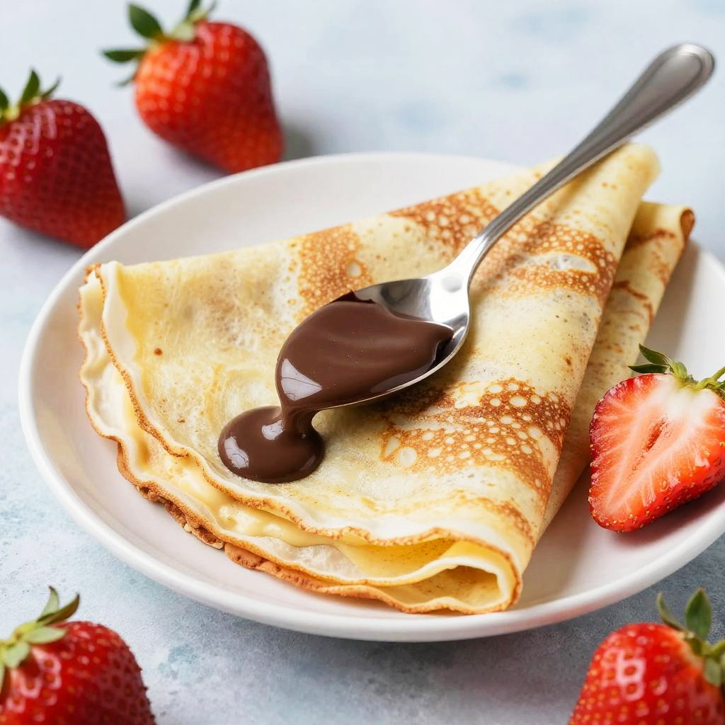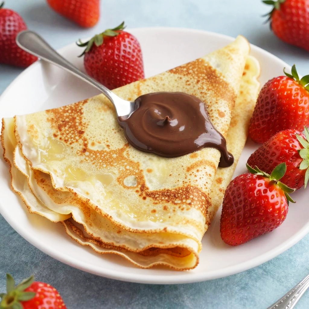 A close-up photo of a white plate with stacked, creamy, speckled crepes topped with a spoonful of chocolate sauce. Bright red strawberries with green leaves are scattered around the plate, creating a colorful contrast. The background is a textured, light blue surface. The image is brightly lit, highlighting the crepes' soft texture and the strawberries' vibrant color.