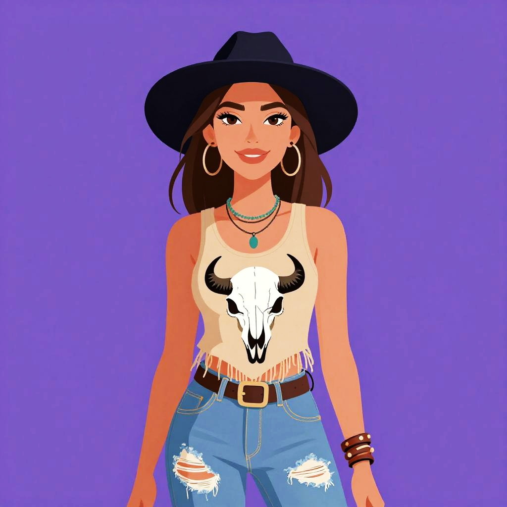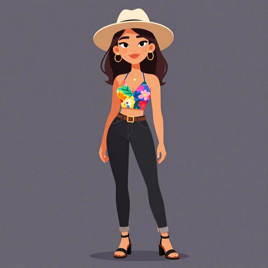 Digital illustration of a confident woman with tan skin, wearing a white tank top with a geometric design, blue jeans, a beige hat, hoop earrings,