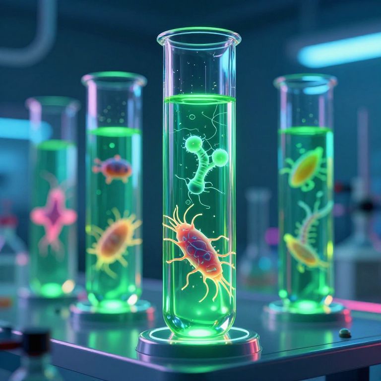 Photograph of glowing green test tubes with illuminated orange fish and green bacteria, set against a dark, neon-lit laboratory background.