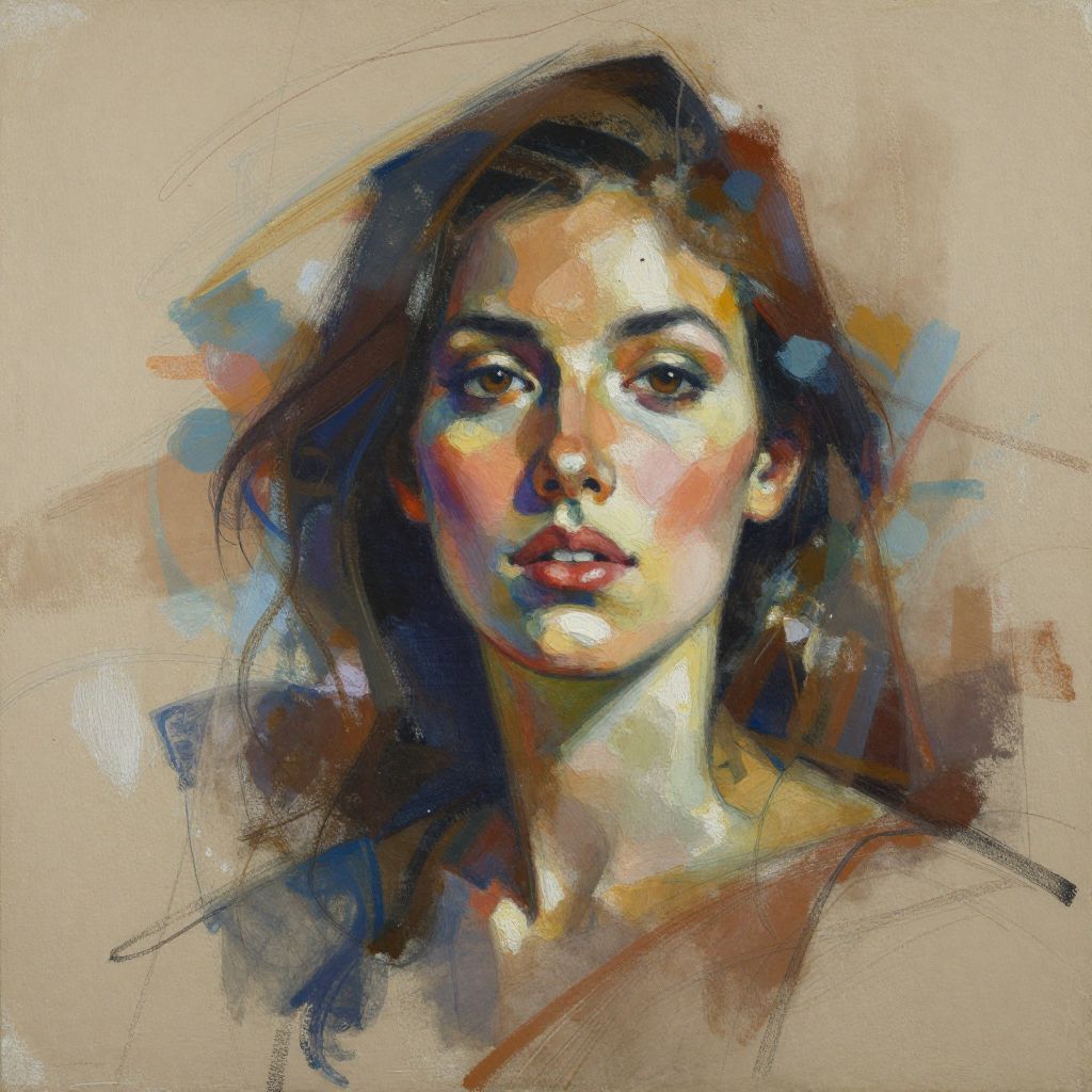 This is a digital painting in a loose, impressionistic style. The subject is a young woman with light brown skin, dark brown hair, and brown eyes, gazing directly at the viewer. Her facial features are softly defined with bold, expressive brushstrokes. She has full lips with a hint of pink. The background is a textured, beige canvas with abstract splashes of blue, brown, and orange, adding depth and contrast to the portrait. The woman's hair is slightly tousled, and her shoulders are partially visible, suggesting a casual pose. The overall color palette is warm and earthy, with a mix of vibrant and muted tones.