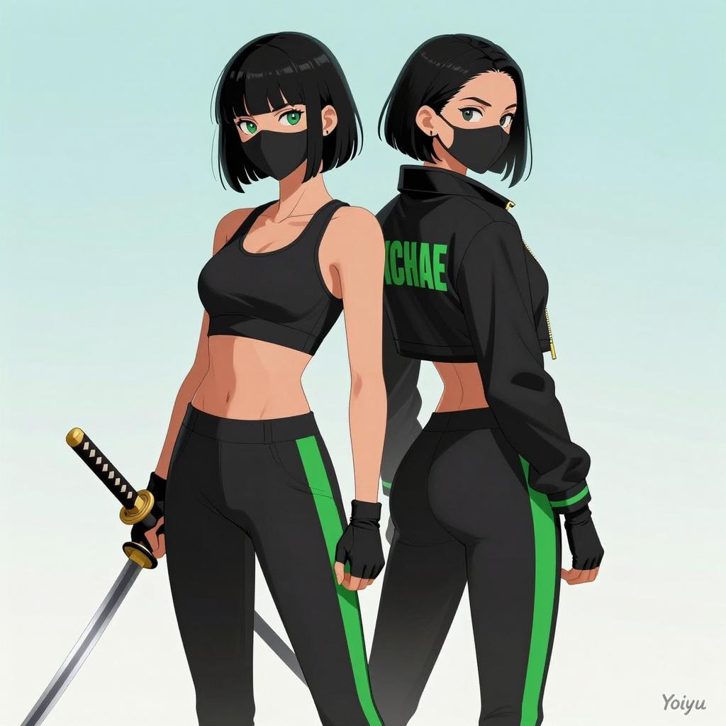 Digital artwork of a young woman with short black hair and striking green eyes. She wears a neon green sports bra, a black choker, and black pants with red stripes. A white and black jacket with red accents is loosely draped over her shoulders. A sheathed katana is visible strapped to her back. The background features a light gray brick wall. The overall expression of the subject is neutral, combining a modern sporty look with a subtle warrior element.
