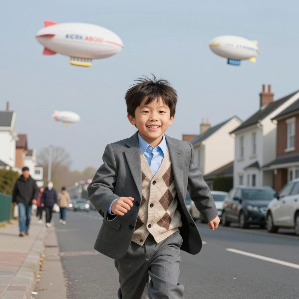 A color photograph of a smiling young boy in the foreground. He has dark hair, wears a gray suit jacket, beige argyle vest, light blue shirt, and gray trousers. He runs with his right arm bent and left arm extended. Several blimps float in the sky. The background shows a street with rows of houses, people walking, and parked cars. The scene is brightly lit with a clear sky.