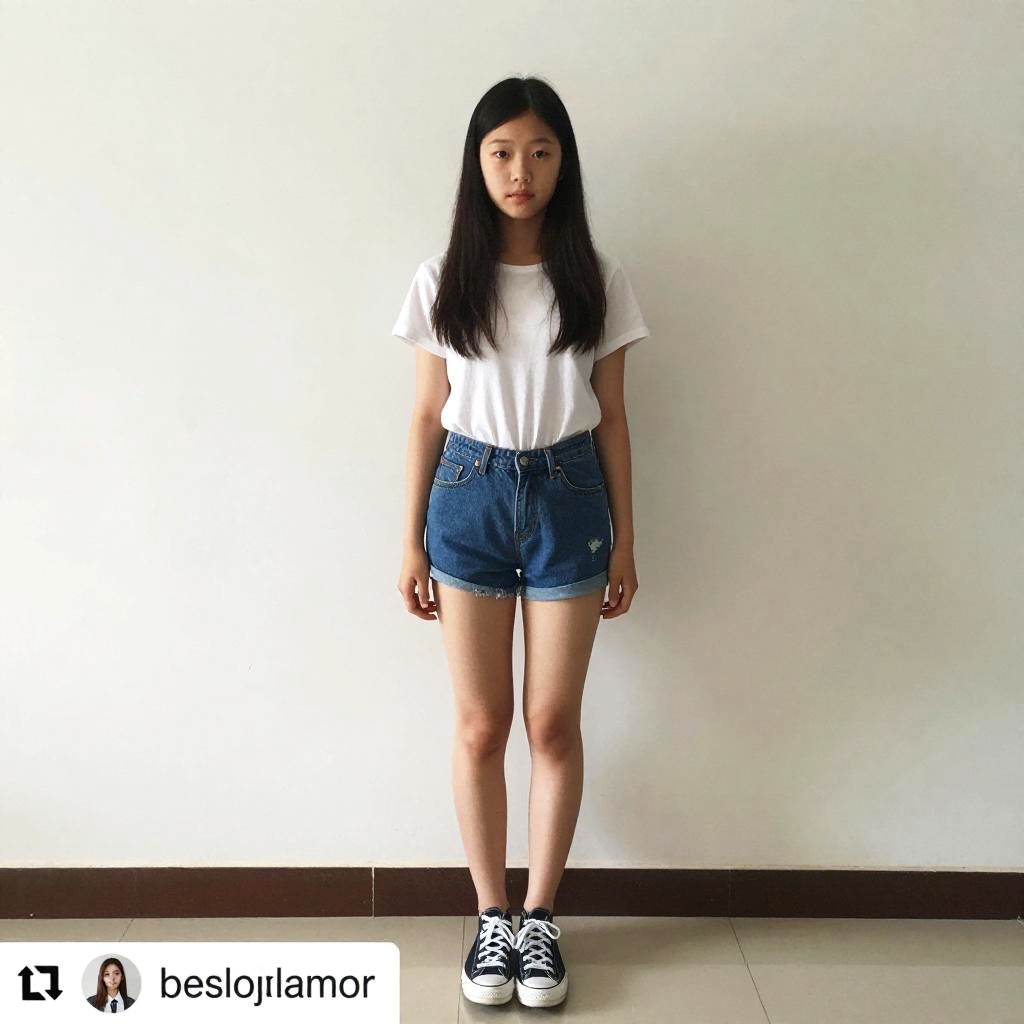 Photograph of an Asian girl with long black hair, wearing a white T-shirt, blue denim shorts, and black Converse sneakers, standing against a