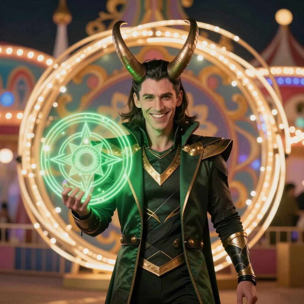A male figure dressed as Loki, the Norse god of mischief, wearing a green costume with elaborate gold details and large curved horns. He smiles mischievously while holding a glowing green circular magical symbol. The background features swirling bright lights and a colorful carnival setting with vibrant decorations and illuminated patterns.
