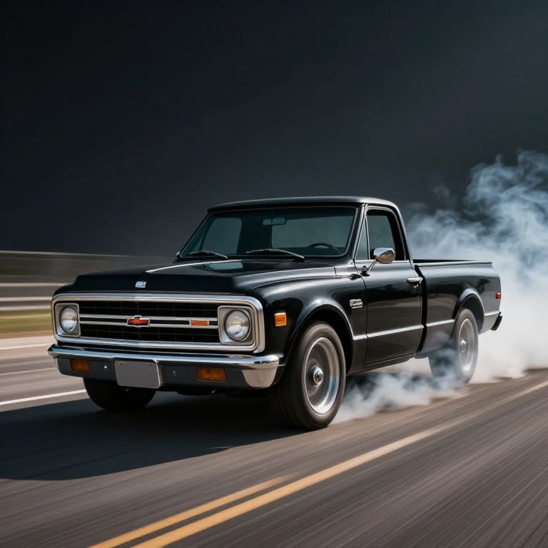 Photograph of a black, classic 1970s Chevrolet pickup truck speeding down a dark, empty road with white smoke trailing from the tires.