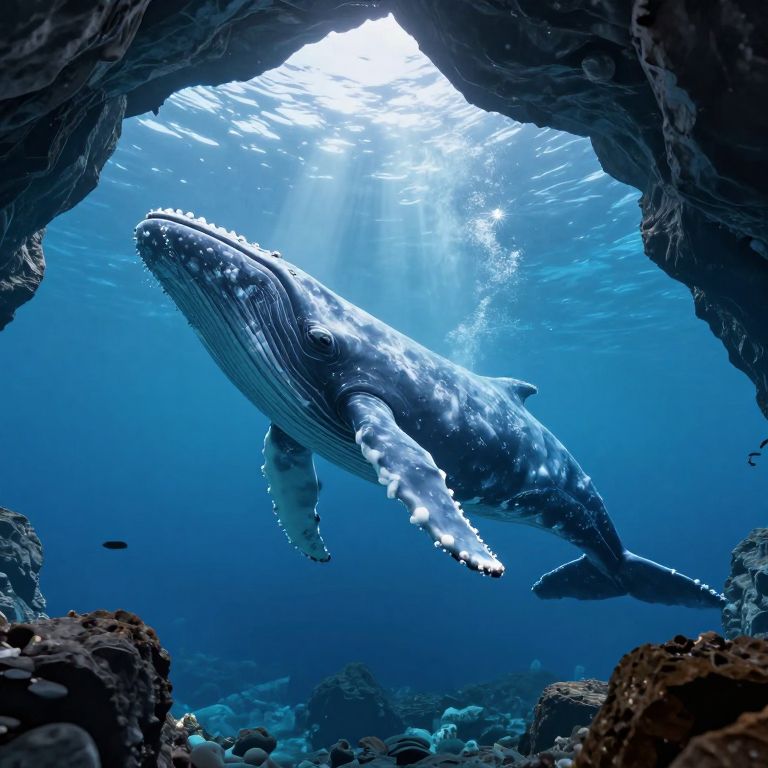 A computer-generated, high-definition underwater scene depicts a colossal whale emerging from a rocky cave into a sunlit ocean, its crystalline form hinting at ancient memories and communication across millennia.