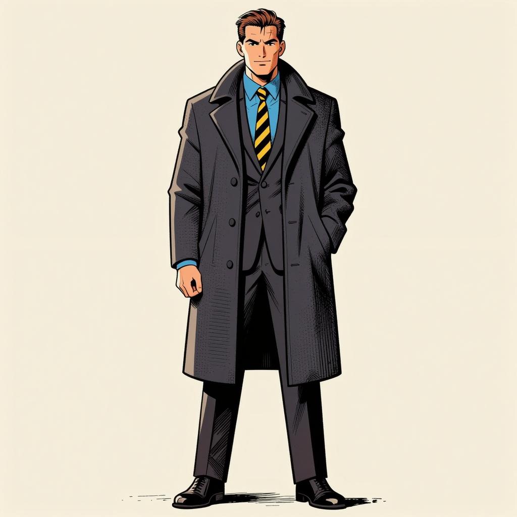 A digitally illustrated man with a confident expression stands wearing a layered outfit consisting of a blue shirt, a striped tie, a dark suit, and a long, textured overcoat. The artwork features a vintage comic book style with bold lines, crosshatching, and a warm, muted color palette.