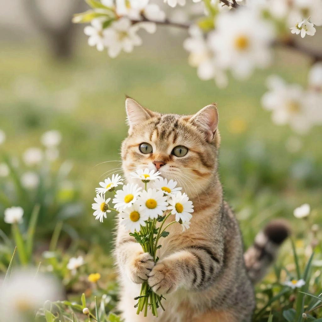 Cat holding flowers, a charming tabby cat gently clutching a colorful bouquet of wildflowers, soft sunlight, vibrant garden background, whimsical and serene atmosphere