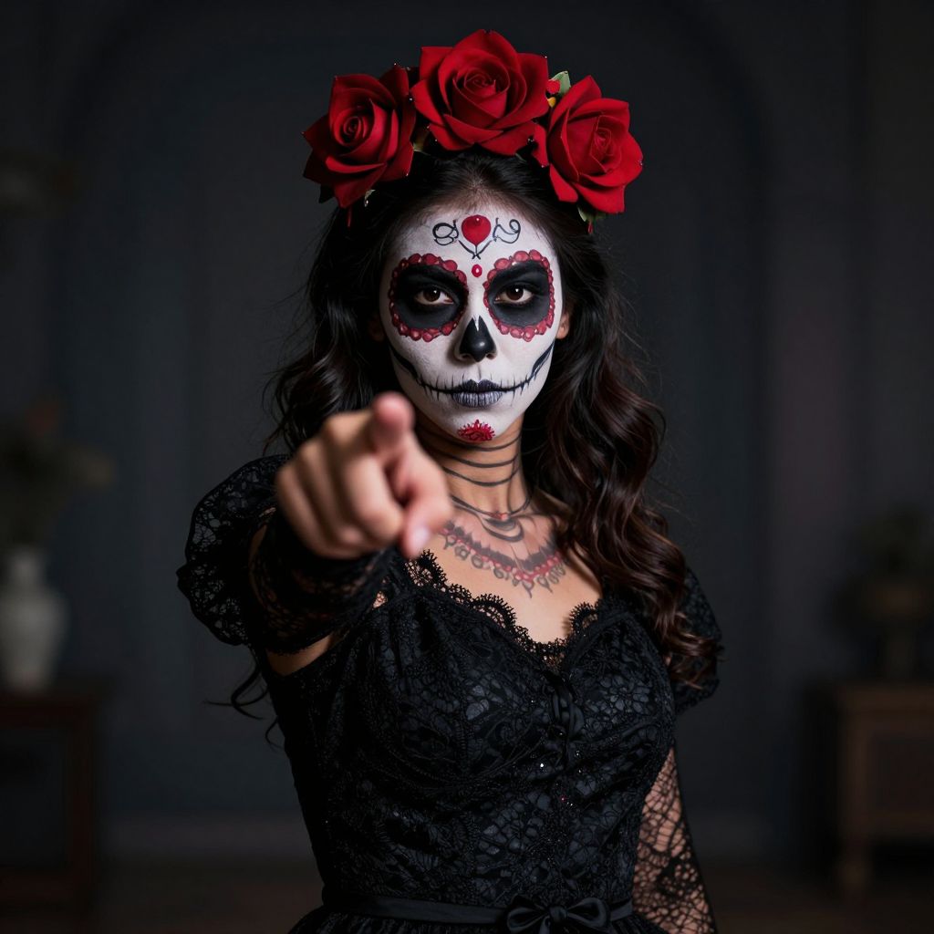 Photograph of a woman with long, wavy black hair, wearing a black, lace dress and a red rose flower crown. Her face is painted as a Day of the Dead sugar skull, with white intricate patterns, red accents, and dark eye sockets. She extends her right hand forward, pointing directly at the camera. The background is dark and blurred, highlighting her figure. The lighting emphasizes the contrast between her white face paint and black dress, creating a dramatic, eerie effect. The image has a gothic, mystical vibe.