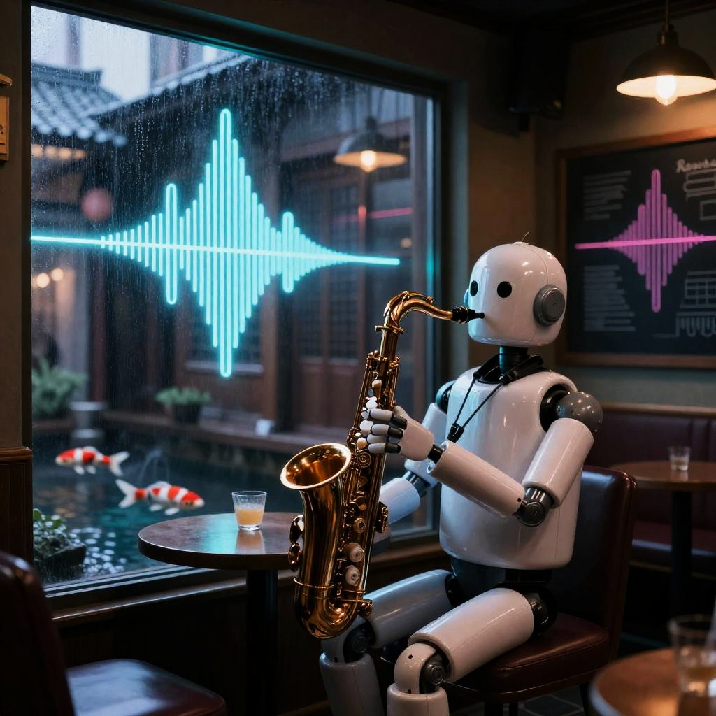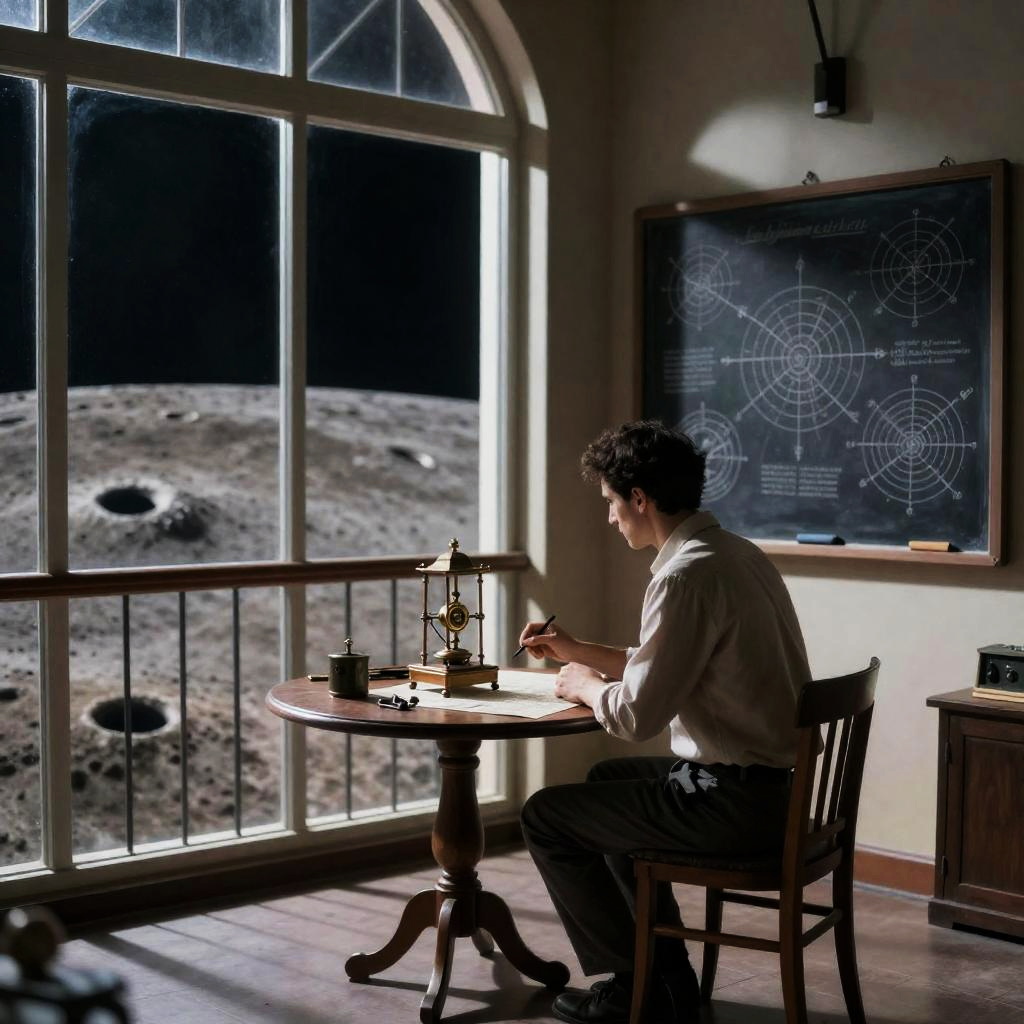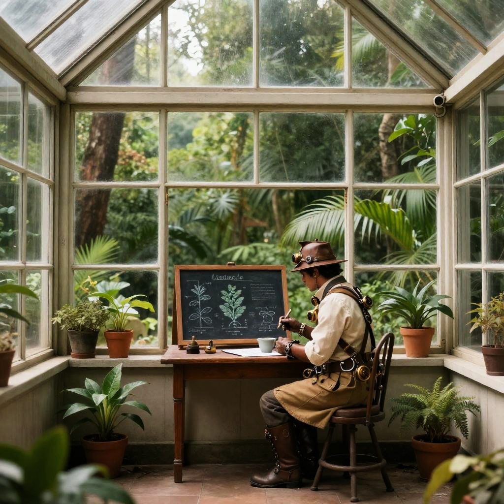 In a sunlit glass conservatory, a steampunk botanist sits at a small table, gazing at genetic plant diagrams displayed on a chalkboard. Through the large window behind, a lush rainforest canopy beyond the panes adds to the tranquil atmosphere.