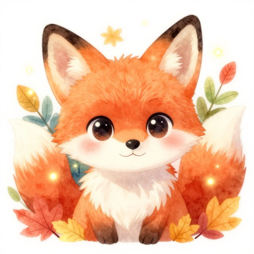 Portrait of Bigcutie Margot as a cute animal hybrid character, blending features of a fox and a bunny with expressive big eyes, surrounded by colorful autumn leaves and twinkling fireflies, rendered in vibrant watercolor style with delicate details.