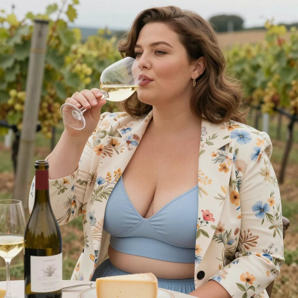 Photograph of a curvy woman with medium-length brown hair and fair skin, sipping white wine outdoors. She's wearing a floral blazer over a low-cut, light blue crop top that reveals ample cleavage. In front of her, there's a bottle of wine, a glass of white wine, and some cheese slices on a table. The background shows a vineyard with green grapevines.