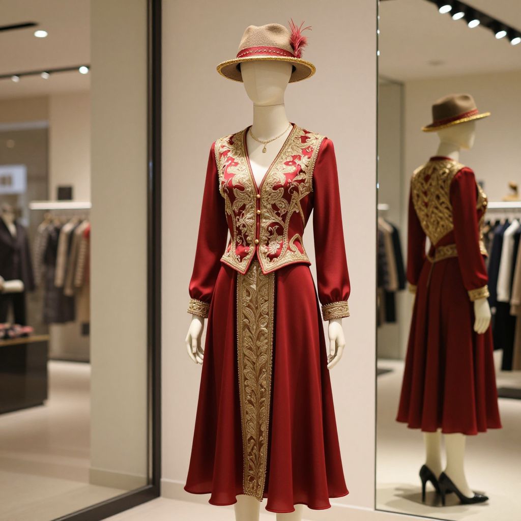 A detailed mannequin standing in a modern retail store, wearing an elegant red and gold outfit with intricate embroidery, a flowing red skirt, gold trimmings, and a matching red-and-gold vest. The mannequin wears a stylish fedora hat with a gold rim and a small red feather, adding a touch of vintage flair. The lighting is soft and warm, highlighting the rich textures of the fabric and the metallic details. The background is a clean, minimalist storefront with glass windows reflecting the mannequin in the mirror. The scene is visually balanced and captures a sense of luxury and sophistication.