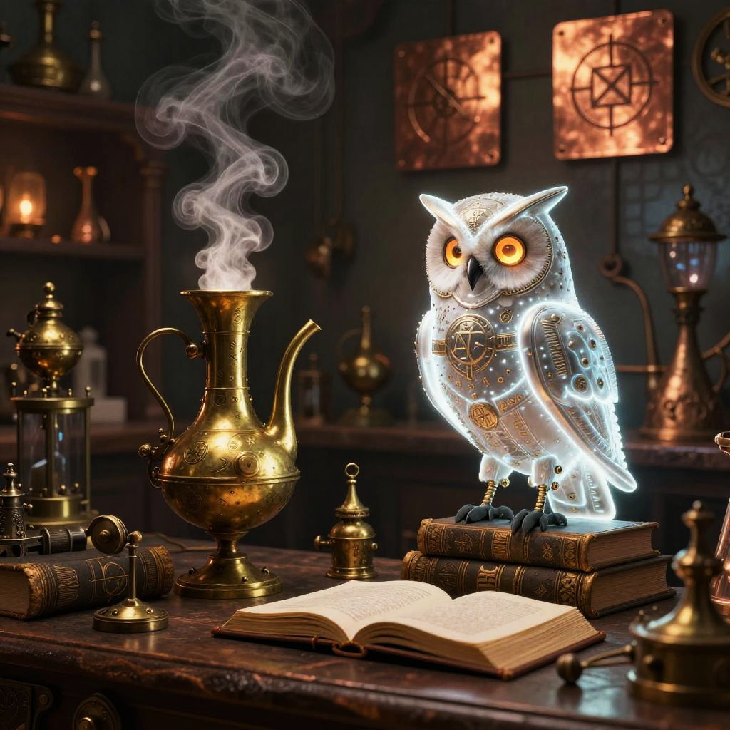 Steampunk fantasy art portraying a mystical alchemist’s laboratory filled with ancient tomes, brass instruments emitting glowing steam, arcane symbols etched into copper plates, and a luminous mechanical owl perched nearby, blending magical and technological aesthetics seamlessly.