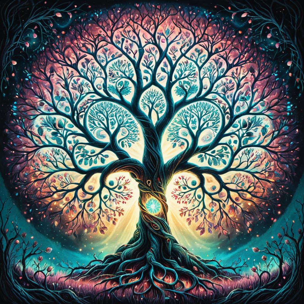 Surrealistic depiction of the Tree of Life, vibrant and otherworldly, intertwining branches and pulsating buds emitting luminescent glows, dreamlike atmosphere, enigmatic ambiance, high quality, detailed surrealism, magical realism, soft pastel tones, radiant lighting, mystical infusion