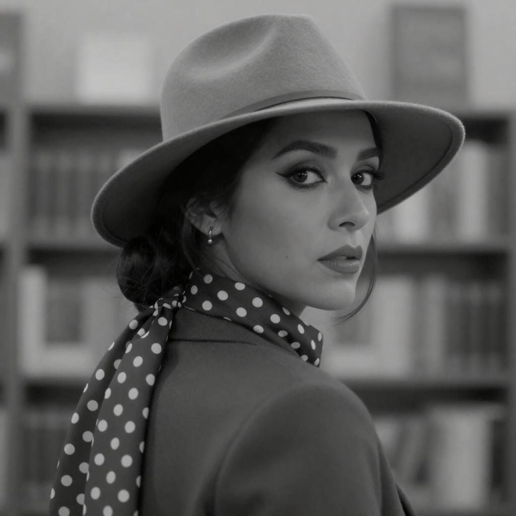 Black-and-white photograph of a woman with dark, wavy hair wearing a wide-brimmed hat and a ured, buttoned blazer. Her expression is serious, with dark, dramatic eye makeup. The hat casts a shadow over her right eye. The background is blurred, emphasizing her face and attire. The image has a high-contrast, vintage style.