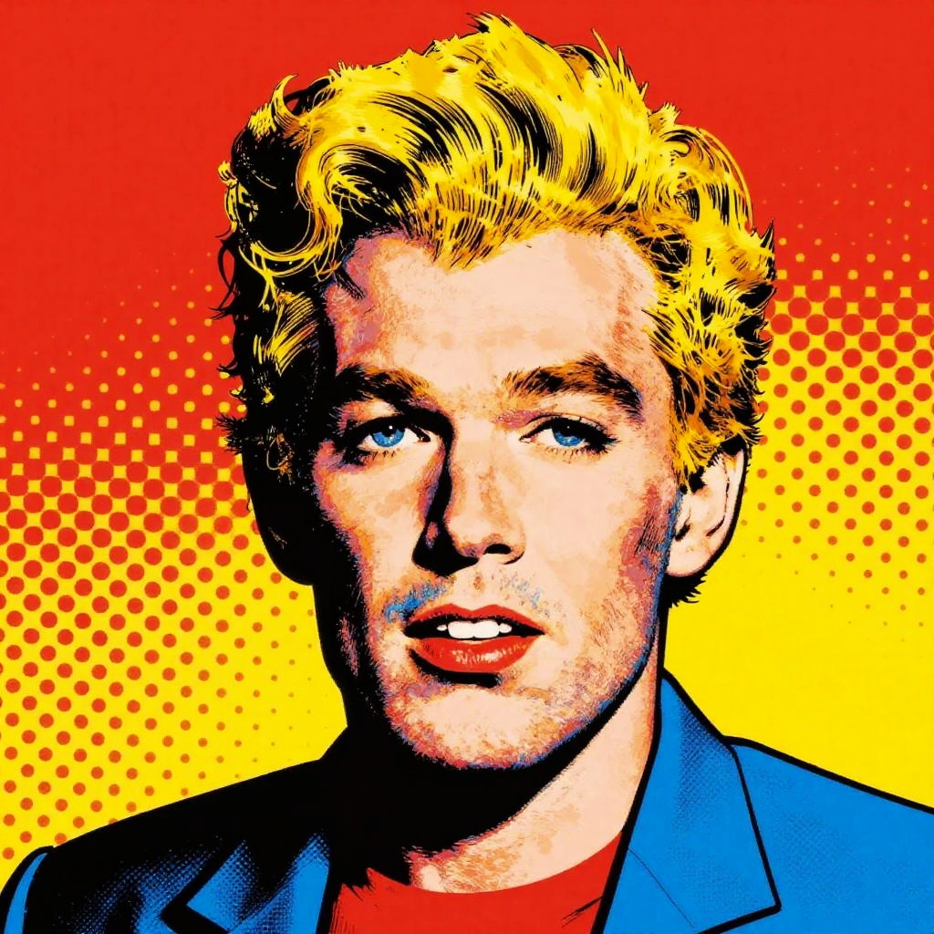Pop art converter transforming a classic portrait into vibrant, colorful blocks of reds, yellows, and blues, bold black outlines, halftone dots pattern background, comic book style, high contrast and saturated tones, retro 1960s vibe